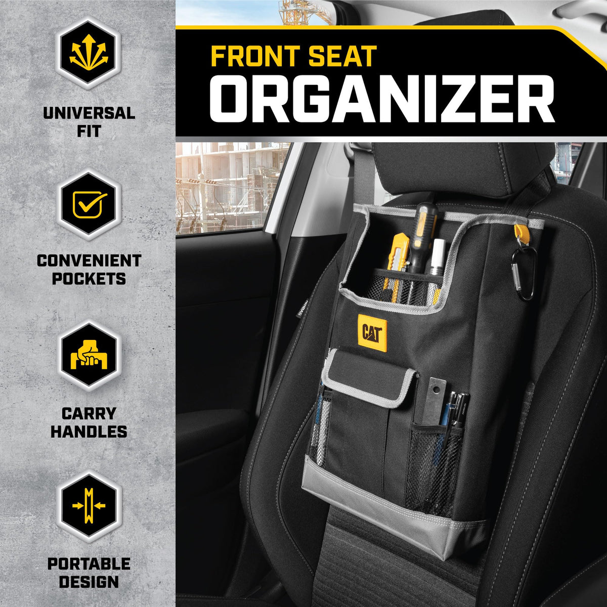CAT Car Seat Organizer for Cars, Trucks, and SUVs - Portable and Multi-Functional Travel AccessoryStay organized on the go with the CAT Car Seat Organizer, a versatile solution for keeping your essentials within reach during travel or daily commutes. Designed for cars, trucks, and SUVs, this portable organizer can be securely attached to front or rear seats using adjustable straps, ensuring a stable fit that wont shift while driving. Whether you need quick access to travel items, work essentials, or kids gear, this organizer offers a practical and convenient way to keep your vehicle clutter-free.Featuring multiple pockets of various sizes, this organizer is perfect for storing everything from snacks and water bottles to electronics, maps, and personal items. The durable construction ensures long-lasting use, even in demanding environments, while the easy-to-remove design allows for portable use outside the car. Ideal for road trips, family outings, or professional use, the CAT Car Seat Organizer is built to handle all your storage needs.With its adjustable design and universal compatibility, it fits seamlessly into most vehicles, making it a must-have car accessory for staying prepared and organized. Whether youre a busy parent, a frequent traveler, or a professional on the move, this car seat organizer is the perfect companion for keeping your essentials tidy, accessible, and secure during every drive.