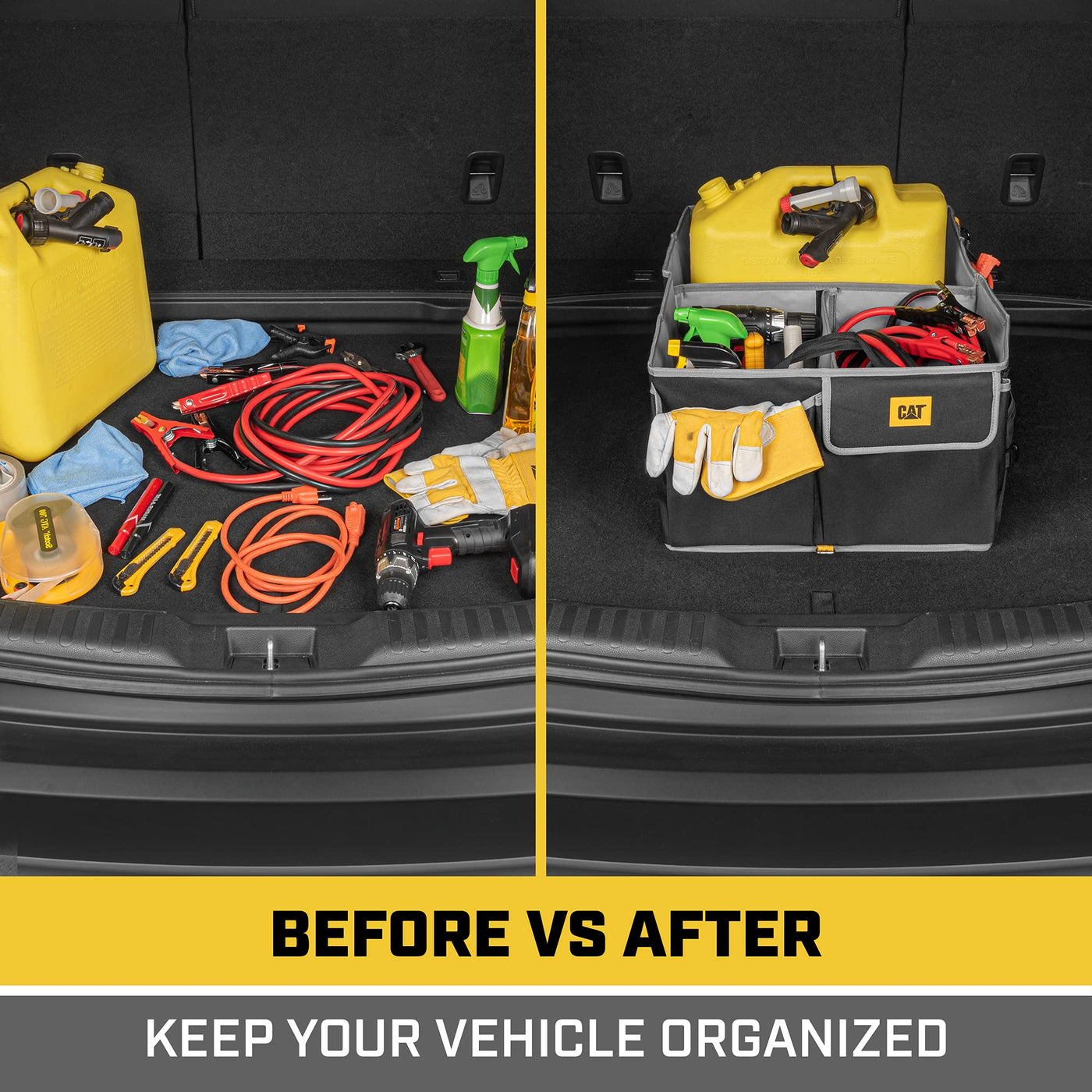 CAT FlexTrunk Car Trunk Organizer - Collapsible Multi-Compartment Storage for Groceries, Tools, and MoreKeep your vehicle organized and clutter-free with the CAT FlexTrunk Car Trunk Organizer. Designed for convenience and durability, this heavy-duty storage solution is perfect for organizing groceries, tools, and other essentials in your car, truck, SUV, or van. With dimensions of 23L x 17W x 11H, it provides ample space to keep your items secure and easily accessible while on the go.Featuring multiple compartments, the FlexTrunk helps you neatly organize and separate your belongings, preventing items from shifting or spilling during transit. Its collapsible design allows you to fold it flat when not in use, making it easy to store without taking up valuable space. Whether youre running errands, heading to the gym, or embarking on a road trip, this versatile organizer adapts to your needs.Built with durable materials, the FlexTrunk is designed to withstand daily wear and tear. Its sturdy construction ensures reliable performance, while its lightweight design makes it easy to carry and handle. Installation is quick and hassle-free, and its non-slip base helps keep it securely in place during drives.