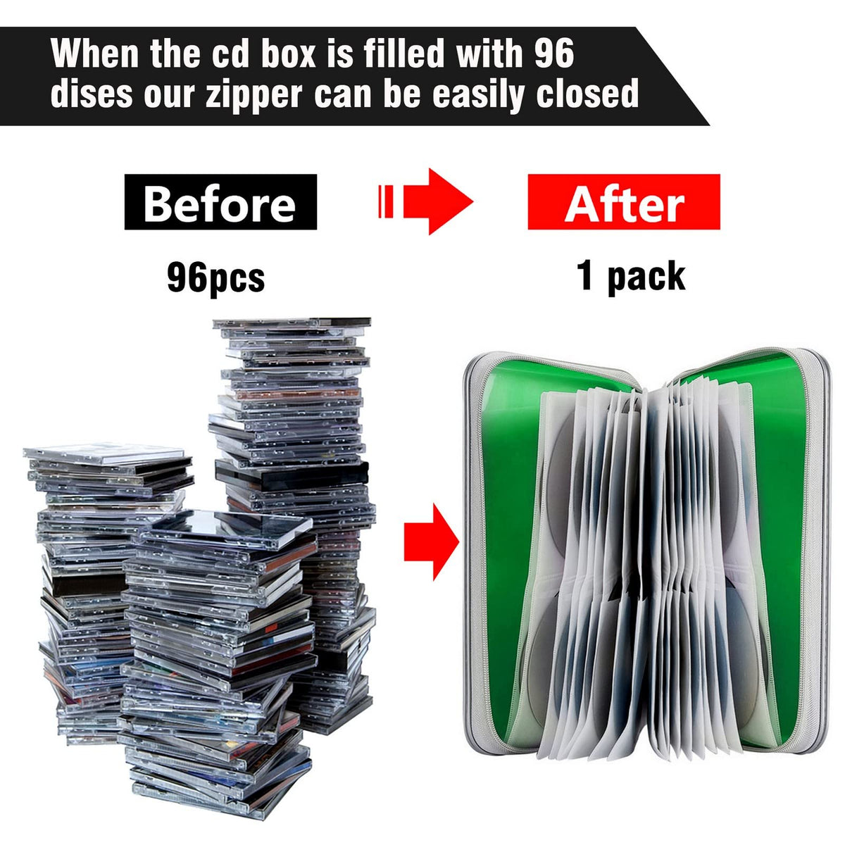 Siveit High Quality Green 96 Capacity Lightweight Carrying Cd/Dvd Storage Bag Our Siveit Cd Case Does Its Job Very Well. Moisture And Strong Plastic +Pp Film + Non-Woven Fabric Case Design Is Durable Enough To Store It Anywhere Without Worrying About Your Cds Being Crushed And Scrached. It Is Compact And Portable, Holding Around 96 Cds Or Dvds With Zippered Closure Without Being Super Big And Bulky.1.Cd Case Size:11.4X6.3X2.4 Inch(Lxwxh)2.Provides Maximum Protection From Dust, Scratches And Other Disk Damage.3.Organizer Holds 96 Cds,The Already Pulled Out Tabs Make It Easy For You To Slide Your Discs Right Into The Pockets.4.Transparent Sleeves For Improved Media Organization.5.Total: 1X Siveit Green Cd/Dvd Wallet Binderattention: We Have Upgraded Our Cd Bags, It Holds 96 Cds, And The Zipper Can Be Closed Easily And Perfectly