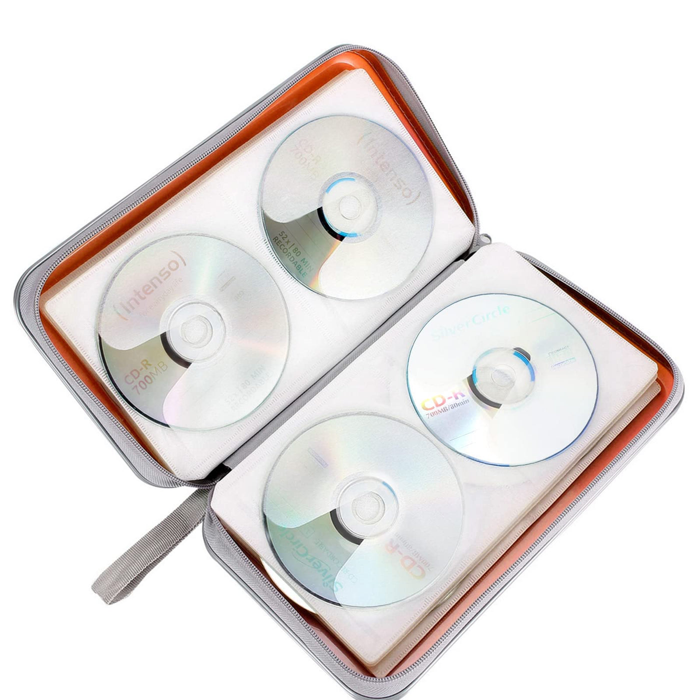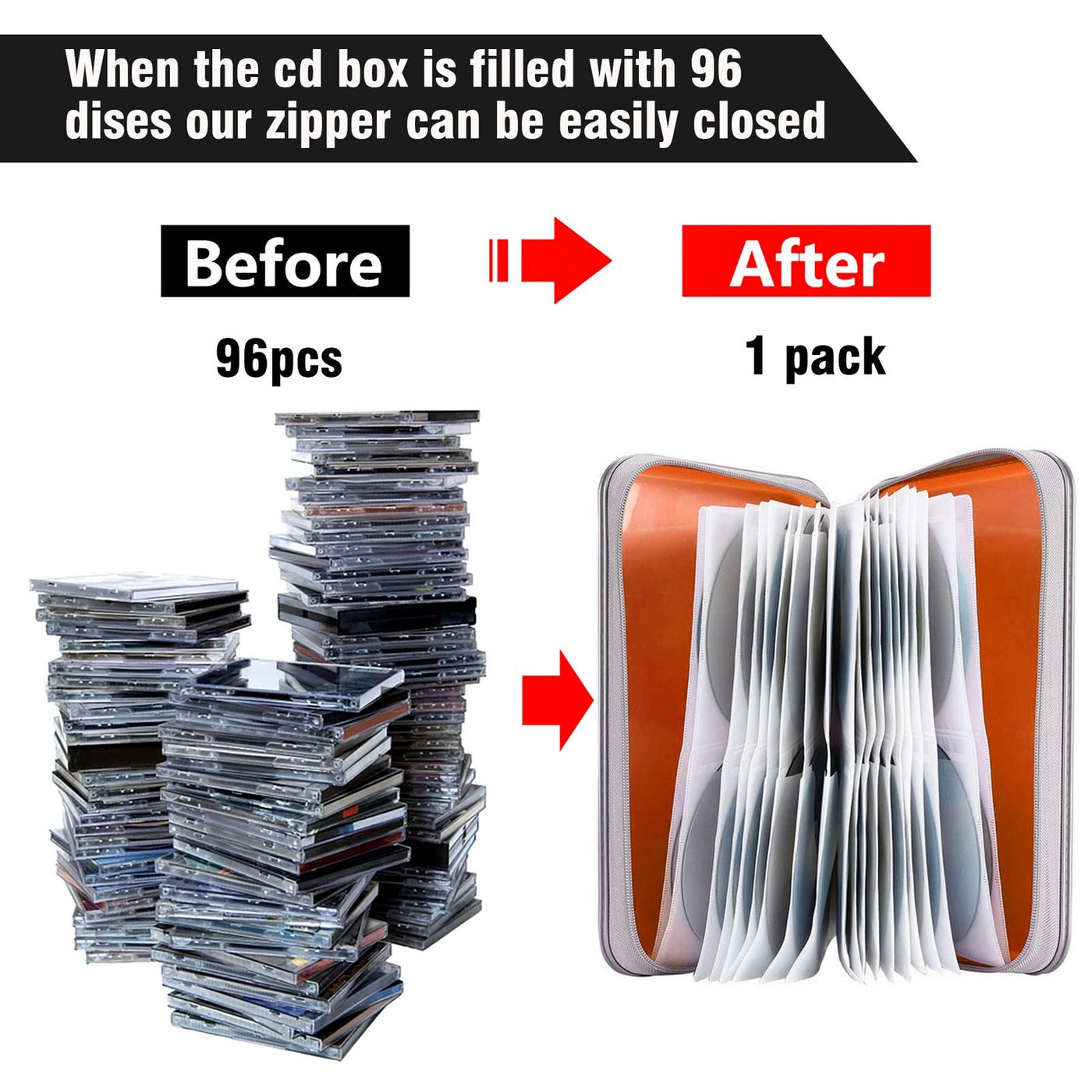 Siveit High Quality Orange 96 Capacity Lightweight Carrying CD/DVD Storage Bag Our Siveit CD case does its job very well. Moisture and strong plastic +PP film + non-woven fabric case design is durable enough to store it anywhere without worrying about your CDs being crushed and scrached. It is compact and portable, holding around 96 CDs or DVDs with zippered closure without being super big and bulky.1.CD CASE SIZE:11.4x6.3x2.4 inch(LxWxH)2.Provides Maximum Protection from Dust, Scratches and other Disk Damage.3.Organizer holds 96 CDs,The already pulled out tabs make it easy for you to slide your discs right into the pockets.4.Transparent Sleeves for Improved Media Organization.5.Total: 1x Siveit Orange CD/DVD Wallet BinderATTENTION: We have upgraded our CD Bags, it holds 96 CDs, and the zipper can be closed easily and perfectly