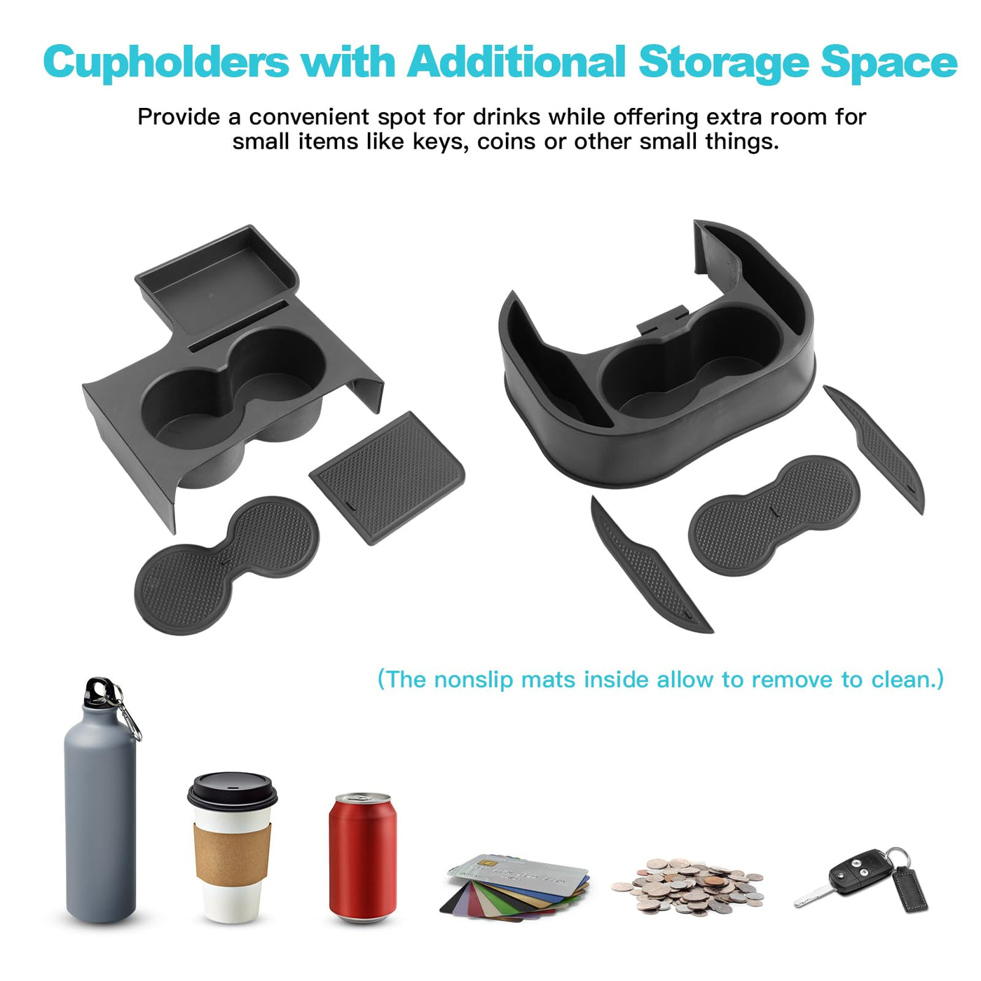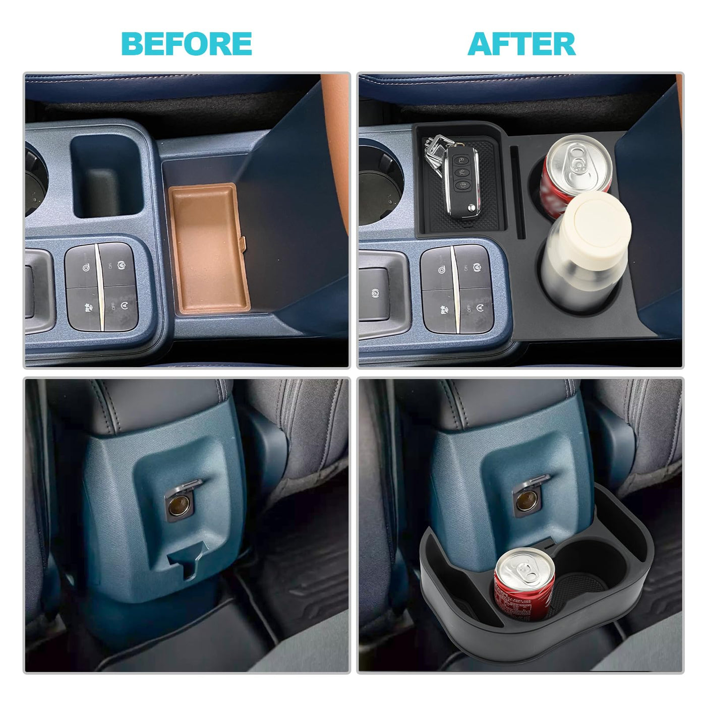 CDEFG 2022-2024 Maverick Car Cup Holder Organizer for Maverick Center Console CupHolders Expander Fit for First Row and Second Row 2022 2023 2024 Maverick Pickup Truck Interior Accessories, 2PCSCompatible with: 2022 2023 2024 Maverick truck PRODUCT FEATURES: 1. Material: ABS Plastic2. Available Colors: Black3. Package Contents: 2 x Maverick truck cup holders, 2 Set of Anti Slip Mats Why Should the 2022 2023 2024 Maverick Owners Have These Cup Holders Installed? 1. The factory Maverick truck only have one cup holder on the console, adding this Maverick cupholder to your truck can hold more bottles or drinks while on long drives.2. Refuse the coins and keys to scatter all over the Maverick truck interior. leave a espcially space for keys and coins within reach 3. Easy to install, no need to drill, just insert them in the areas. 4. These cup holders with organizer come with removable non-slip rubber mats on the bottom for each compartment, which help keep unnecessary noise down along with the Maverick truck cup holders.5. The rubber mats is easily removable for cleaning, you can remove it if you need to clean. 6. Solid and durable, it wont slide out when stopping, accelerating or decelerating.7. These cupholders make it easy to stay hydrated for both adult and children during long drives, adding to your whole family comfort by keeping your drinks within reach. 8. By keeping drinks securely in place, these cup holders help prevent accidental spills, which can be especially important when driving to maintain a clean and safe interior, contributing to a distraction-free driving experience.