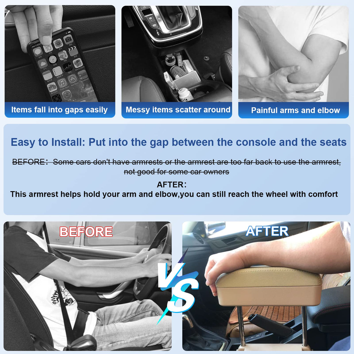 ?? CDEFG Car Armrest Support Elbow Rest Pad Armrest Extender, Console Storage Organizer, Adjustable Height Comfort Wrist Rest Pads, Universal Fit for Most Vehicle Models Except the Models with Manual Transmission, Mini SUVs, CX 5???? Quantity: 1?? Colors: Black line/ Red Line/ White Line/ Beige/ Brown?? Why Do You Need This Armrest Support?? Your arm, wrist even shoulder will get tired and painful after a long drive without a support? Some cars are too far back and your arms always hurt when driving. This arm rest extension help you work it out? Some car models, like Ecosport, RAV-4, Pilot etc., do not have armrests built into the driver seat, which means your right arm has nothing to rest on when driving on a trip, it is not that easy to live with that ? This arm rest extension is adjustable height, its arm rest that can be adjusted to the height you want? This car armrest box elbow support pads is made of PU leather and ABS plastic, soft and stable, can be adjusted and easy to install, you can swivel it to get the stuff inside easier? This armrest has a great extra compartment storage box as well for your small stuff like phone, wallet, cigarette, keys, coins, credit card, pens, sunglasses, etc.handy and useful? Compatible with all vehicle models, but not fit for the models with MANUAL TRANSMISSION?? If there is any issue about this armrest extender, pls let us know and well work it out for you!