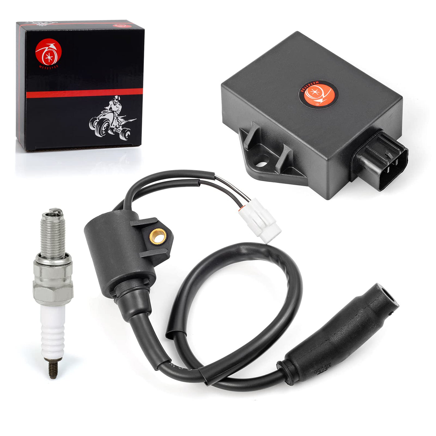 Q: What is included in the package?A: The package includes one CDI BOX, one Ignition Coil, and one Spark Plug, providing everything you need for installation and replacement.