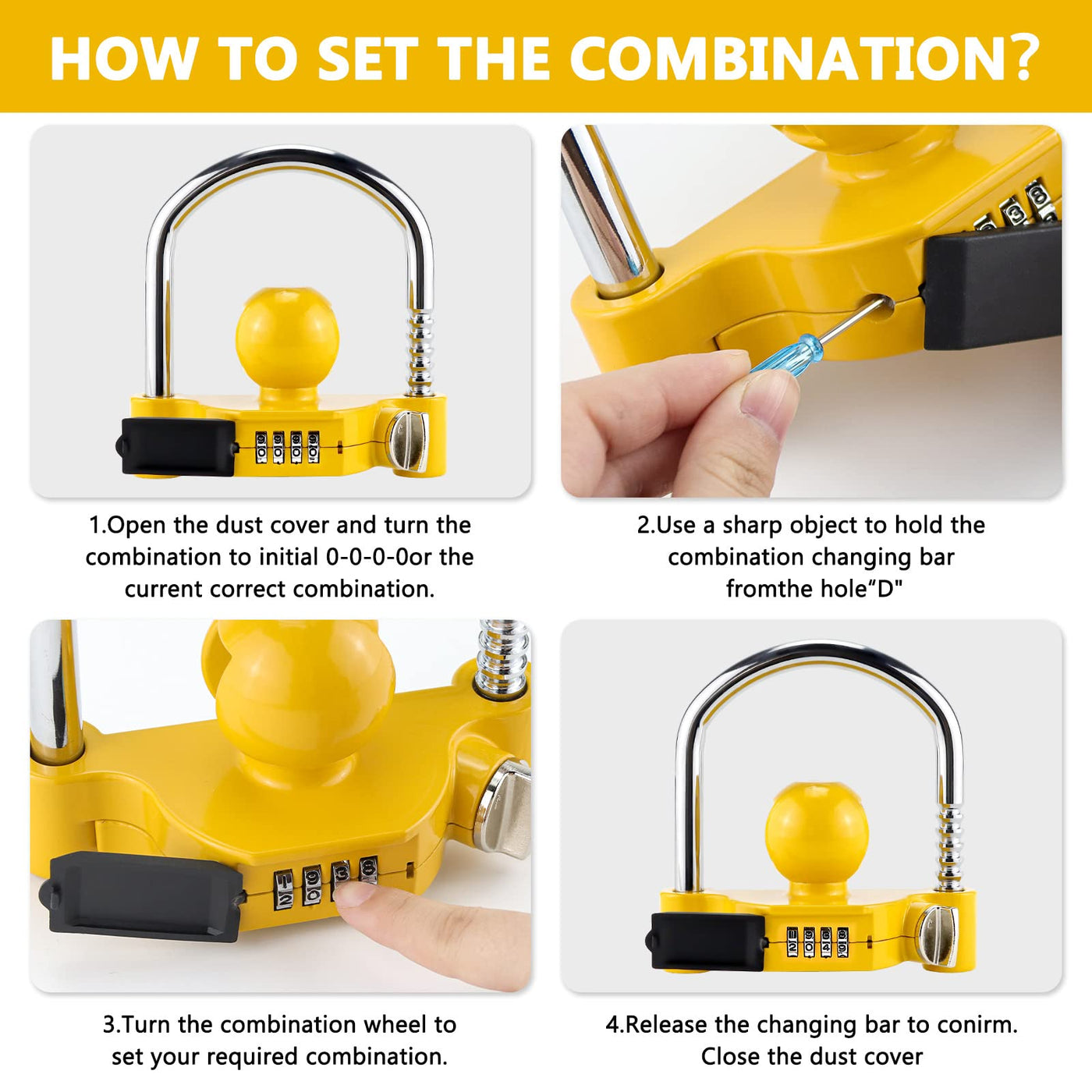 Q: How does the combination lock work on this trailer hitch lock?A: The combination lock operates with a four-digit code, with the default unlock password set to '0000'. Users can easily change the password at any time, allowing for convenient access without the need for keys.