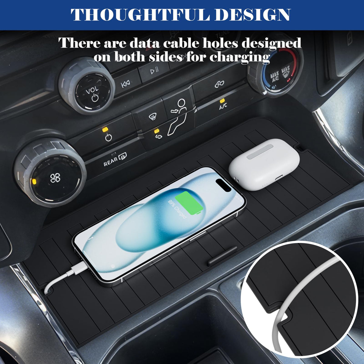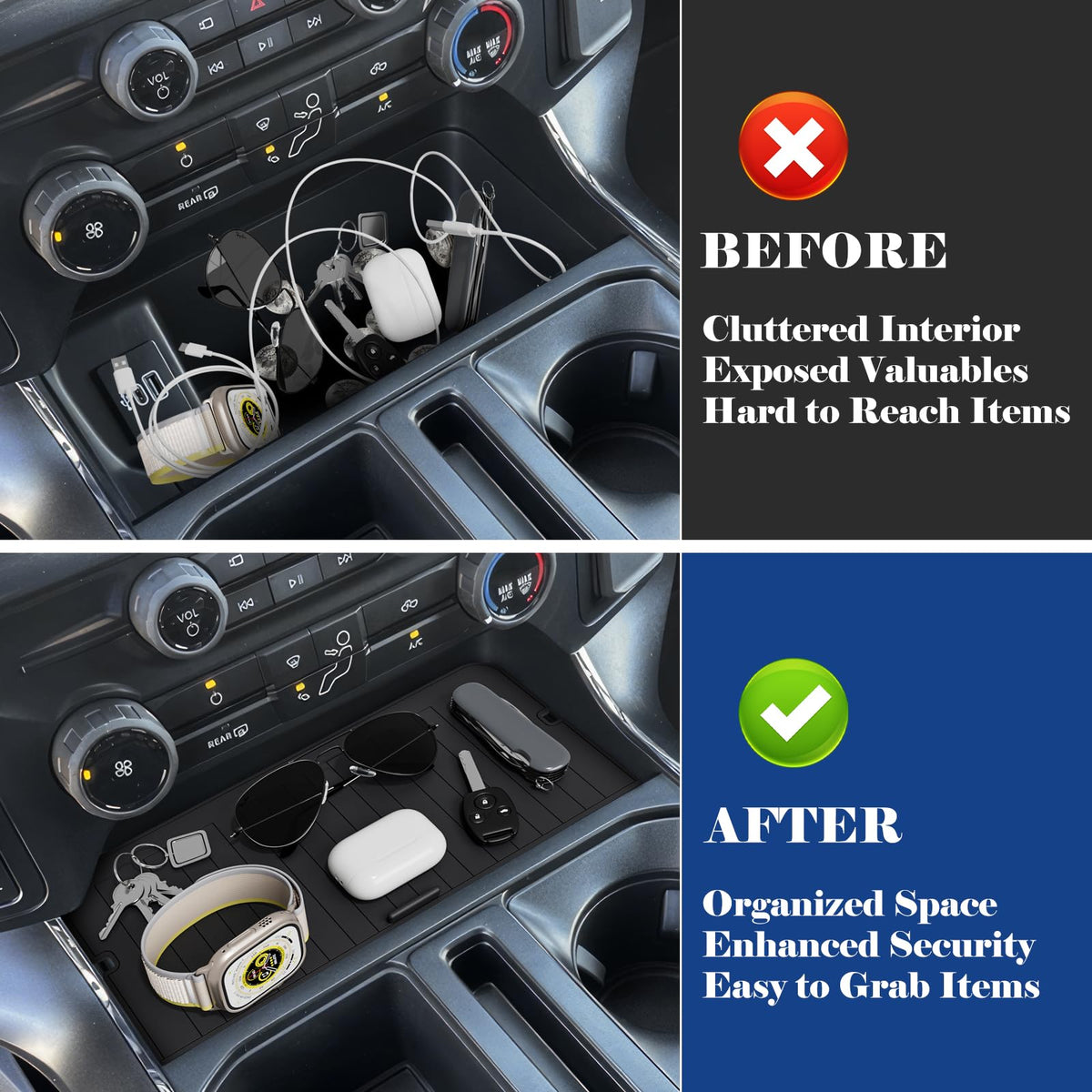 Sinvanho Center Console Compartment Cover Organizer for Ford F150 Accessories 2021-2024 2025 & Lightning XLT 2022 2023 2024 Middle Console Secret Pocket Lid Interior Hidden Storage Tray Panel with USB Holes (Only fits into The Open Pocket in Front of The Shifter) Features: OEM FIT: The center console compartment cover is specially designed according to the original car, perfect fit for 2021 2022 2023 2024 2025 Ford F150 and 2022 2023 2024 F150 Lightning XLT. Fits into the open pocket in front of the shifter. NOT fit models with a wireless charging console lid. DUAL-LAYER SPACE: Secret compartment cover for Ford F150 creates a hidden compartment, you can hide valuables like cards, keys, cash, or wallets and the charging ports below, and set your phone and other commonly used small items on the cover. REASONABLE DESIGN: Our secret pocket cover reserves dual USB holes for easy charging while maintaining a clean setup, simply plug the data cable and run it through the reserved holes before covering the pocket. You can also unplug the cable at any time by opening the cover. ANTI-SLIP PANEL: The surface of the F150 Pocket Cover is made of non-slip rubber with high flexibility, keeps objects in place while driving, and reduces noise. And the back is made of sturdy ABS plastic that will not easily deform under pressure, ensures long-lasting stability. EASY TO INSTALL & REMOVE: Each center console organizer has an small easy-to-grab tab for easy movement, no adhesives or tools required, just a few seconds to install and remove. And the accessory fits perfectly into the interior shape of the center console, look like they come with the car as original. Package Included: 1 * Center Console Compartment Cover for Ford F150