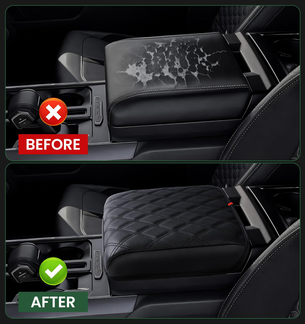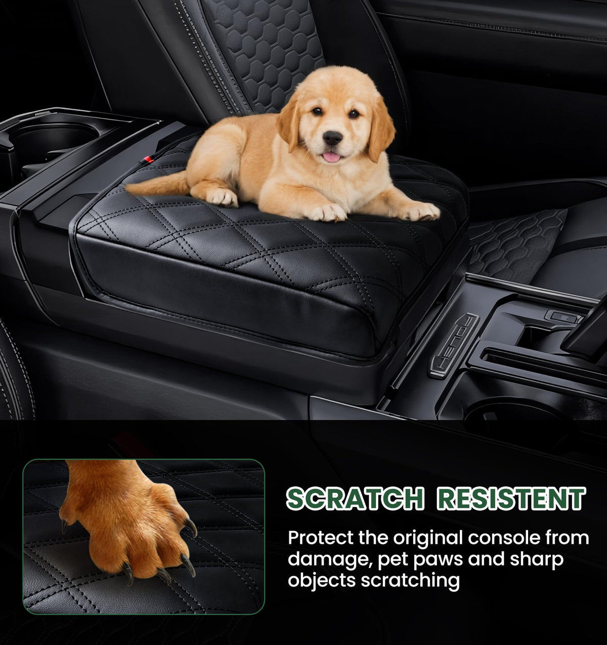 Center Console Cover for 2021-2025 Ford F150 Truck Interior Accessories, 2022-2025 F150 Lightning Armrest Cover Middle Console Cover Anti-Scratch Protector Cushion Pad (Only for Work Surface Console) Features: CHECK FIRST: This center console cover is designed for 2021 2022 2023 2024 2025 Ford F150 & 2022-2025 F150 lightning, fits like a glove, and does not affect the opening or closing of the armrest box lid. (ONLY for the Work Surface Console, NOT for the Bucket Seat Console and the Jump Seat Console). FULL PROTECTION: Sinvanho ford armrest cover is made of scratch-resistant vegan leather, and it is wide enough to wrap the entire top of the armrest box lid to avoid pets' claws, rips, fingernails, sharp objects, dirty liquids, sweat, abrasion, dust, or key scratches, provides full protection for your center console, keeps your car interior always in brand new condition. WATERPROOF PU LEATHER: Premium PU leather material is waterproof, and easy to clean, just wipe it with a towel or tissue. In the meantime, this armrest cover hides an already damaged center console so that you dont have to replace the original console. STYLISH AND COMFORTABLE: The customized console cushion features high quality sewing and crafts and stylished appearance, makes your car armrest look luxury and density sponge design brings good resilience comfort, provides comfortable braces and relaxes your arms. A must-have F-150 accessory for anyone wants comfort. BEAUTIFUL AND COMFORTABLE: The customized console cushion features high quality sewing and crafts and stylished appearance, makes your car armrest cushion looks luxury and density sponge design brings good resilience comfort, provides comfortable braces and relaxes your arms. A must buy for every driver who wants a more comfortable driving experience. Package Included: 1 * Armrest Cover for Ford F150