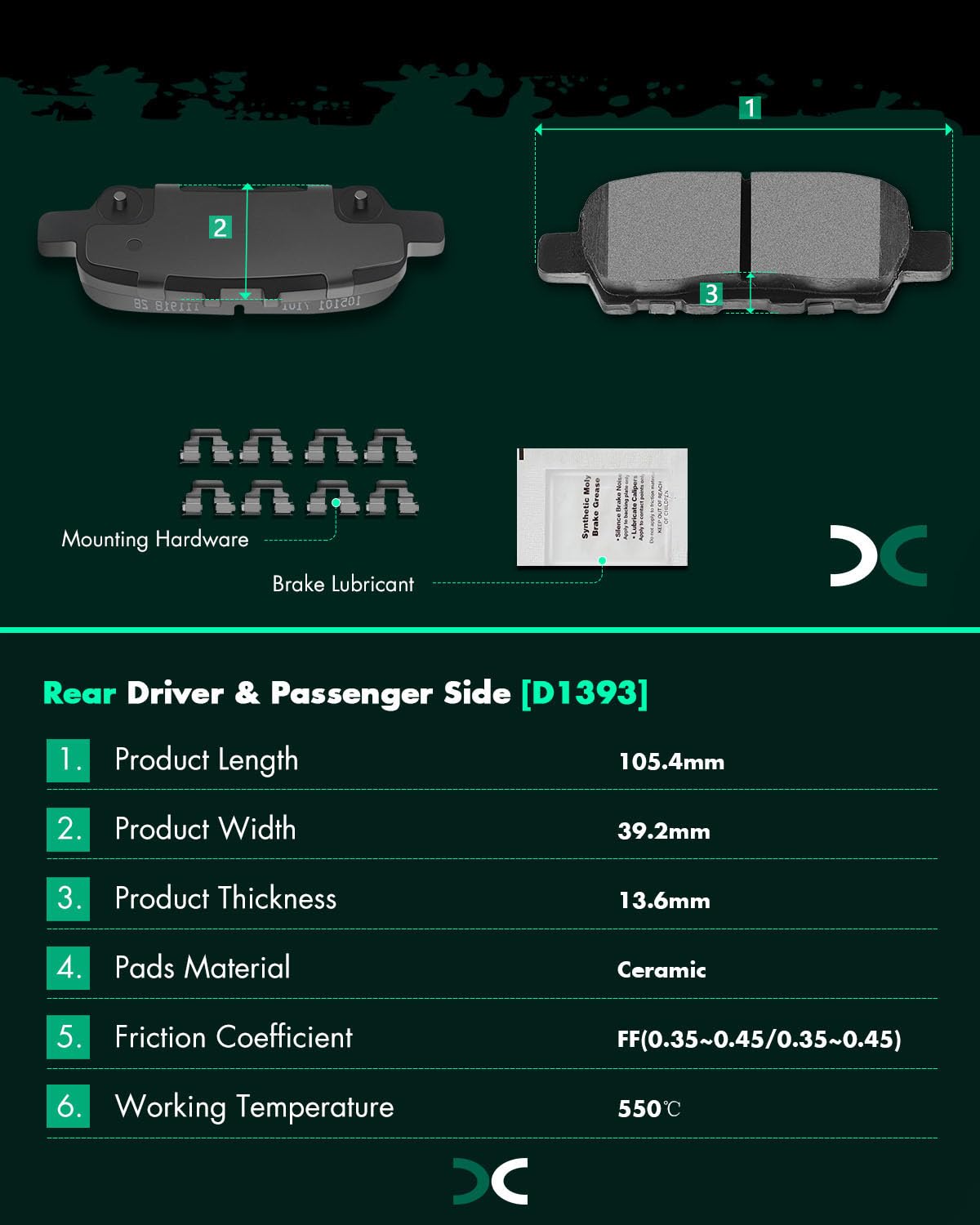 Compatibility Information:2009-2012 for Nissan MuranoSpecifications:Placement on Vehicle: Front Rear Left and RightBrake Pad Compound: CeramicOEM PART NUMBER(S):4 X Front Ceramic Brake Pads - ATD969C,D969-78704 X Rear Ceramic Brake Pads - D1393-8501,D1415-8405Package Including:8 Ceramic Brake Pads