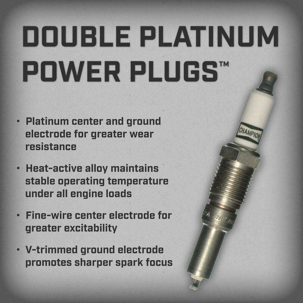 Champion Double Platinum Power spark plugs deliver more powerful performance. Featuring exclusive Heat-Active alloy, platinum fine wire center electrode and platinum pad ground electrode provide maximum life and sharper spark focus.