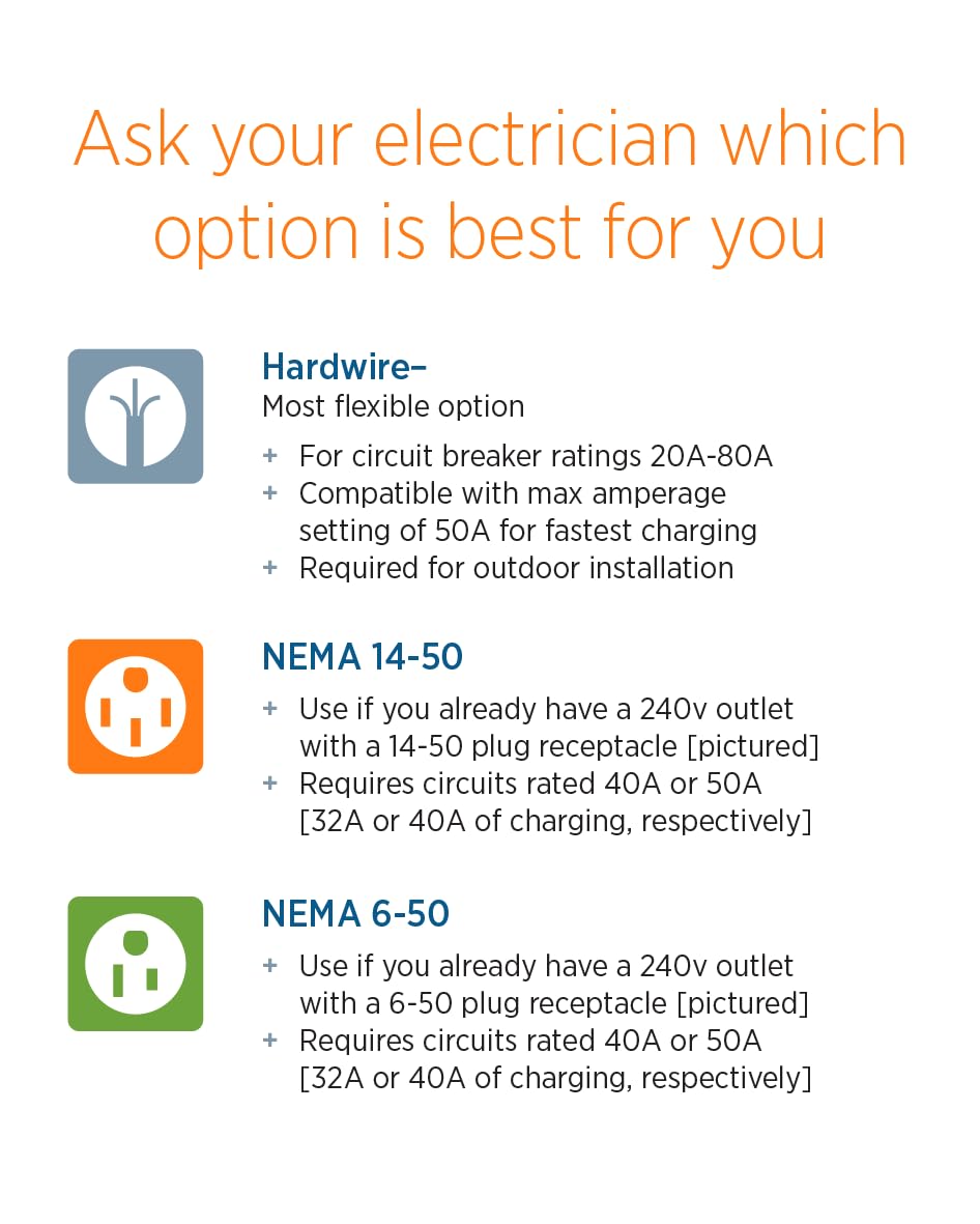 Q: What is the required electrical setup for the ChargePoint HomeFlex?A: The ChargePoint HomeFlex requires a 240V outlet with a 6-50 receptacle and must be installed on a dedicated 50A circuit to ensure optimal performance.