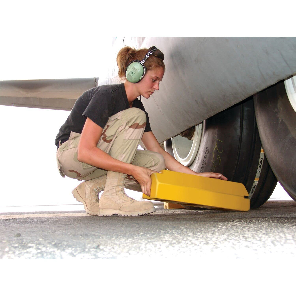 Checkers Industrial Safety Products Tigerchocks Ac4614-Lr-Rp Urethane Military Aircraft Wheel Chock With Rubber Base, Hi-Vis Yel
