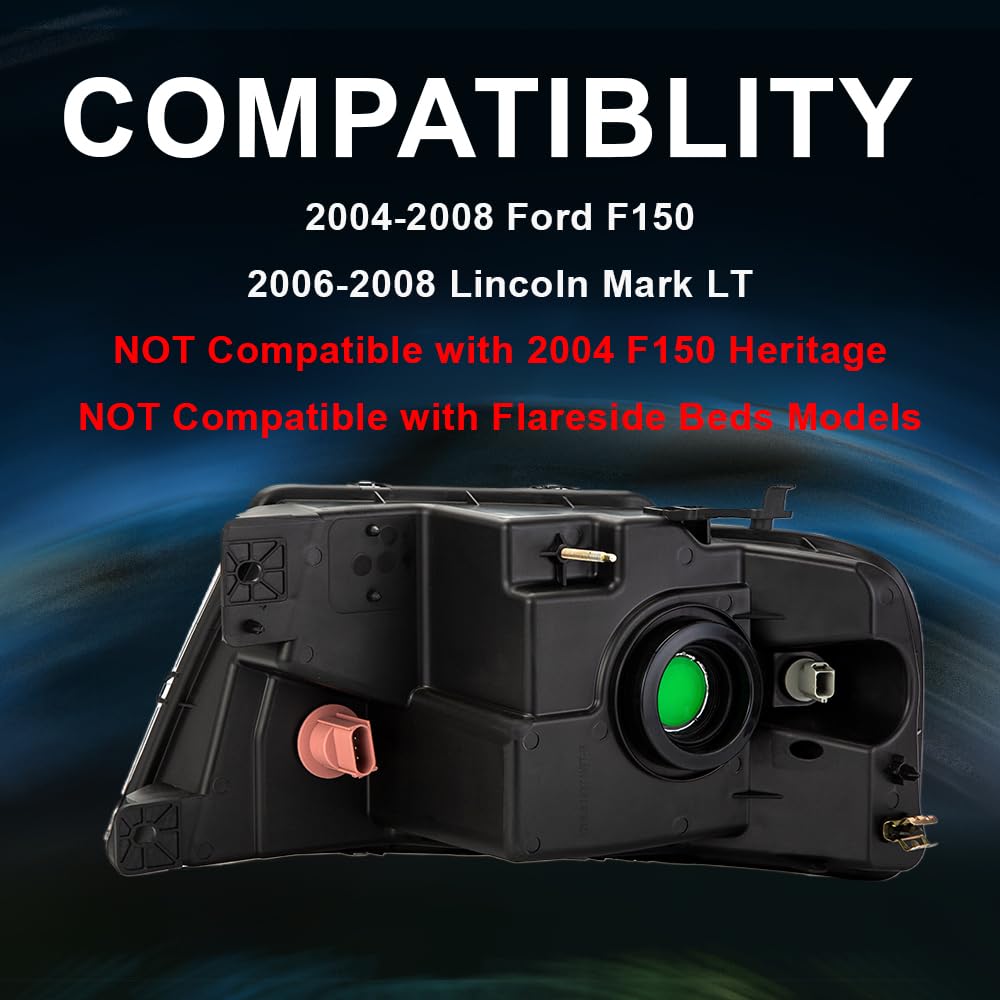 Title: Headlights Application: Compatible with 2004-2008 Ford F-150 Compatible with 2006-2008 Lincoln Mark LT Feature: Color: As show in the picture. 100% Brand New Headlight Plug-n-play operation, direct bolt-on fitment or replacement for the stock unit Comes with a complete set of headlight (driver and passenger side) Brings a different appearance to vehicle that great for show use or to replace old and worn headlights Requires no modification or drilling Package includes: 1 Pair of Headlights (Right & Left Side)