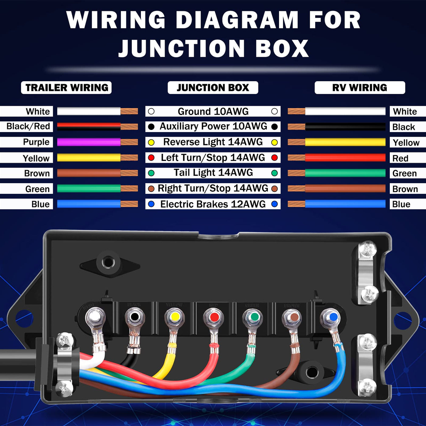 Heavy Duty 15 Ft 7 Way Trailer Cord & Junction Box Kit With 12V Breakaway Switch And Plug Holder Provide A Fast And Simplified Way For Wires Connection As Well As Keeping All Your Trailer Wiring In Order Junction Box- The Junction Box Is Equipped With 7 Color-Coded Terminals And Wires, Which Can Easily Identify The Corresponding Functions Of The Wires And Facilitate Wiring Strong Junction Boxes Are Waterproof And Dust Resistant To Increase The Service Life Of Trailer Cords Ure Copper Power Cord- The 7-Way Trailer Cord Is Made Of High-Quality Pure Copper And Has A Long Service Life And Has Excellent Electrical And Thermal Conductivity, To Ensure The Normal Use Of Car Lights In The Process Of Driving (Such As Turn Signal And Brake Lights, Etc) Breakaway Switch- This 12V Trailer Breakaway Switch Provides Safer Traction By Connecting The Trailers Breakaway Battery And Trailer Brake If The Trailer Is Disconnected While Being Towed, The Cable Will Release And The Brakes Will Be Activated Etailed Wiring Instruction- Cheemuii Trailer Cords Use 7 Color-Coded Wires, And The Color Code Adopted Is Suitable For Most Rv Trailer Wiring Standards, But As There Are Some Differences Between Trailer Manufacturers, We Have Updated The Detailed Instructions, Please Read Them Carefully Before Use Please Refer To The Wiring Instructions And Connect Cables According To The Color And Function Of The Wires To Avoid Errors Wide Appliation- Suitable For Trailers, Rvs, Campers, Caravans, Food Vans And Other Towed Vehicles Perfectly Connected Taillights, Brake Lights, Reverse Lights, Turn Signals And Auxiliary Power