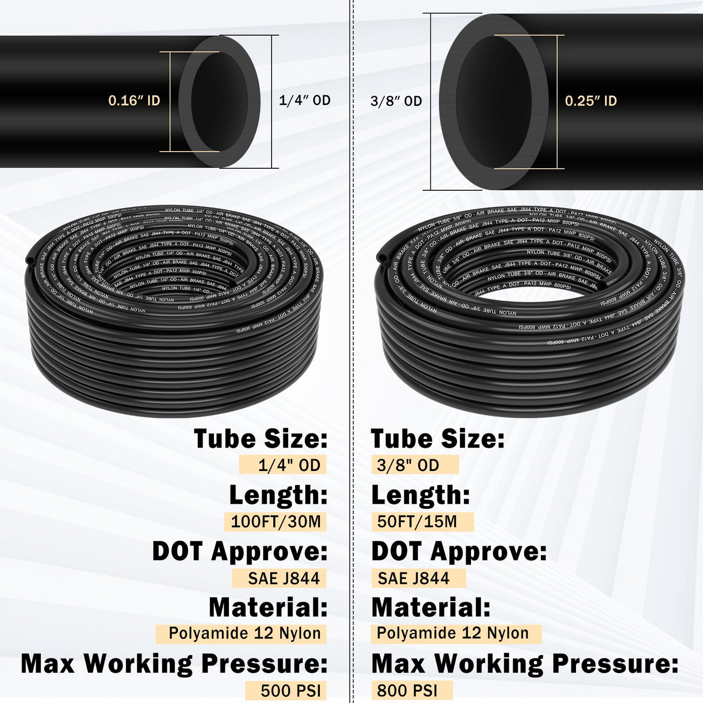 CheeMuii 76 PCS Brass DOT Air Line Fittings with 100FT 1/4 '' and 50FT 3/8 '' DOT Air Line Kit Push Lock Air Fitting Quick Connect & NPT Thread Fittings with Air Tubing Set 79 PCS PACKAGE INCLUDE: 100 ft 1/4 '' dot air line hose, 50 ft 3/8 '' dot air line hose, 18 pcs brass tube tee fittings, 28 pcs brass straight union, 14 pcs brass straight push connectors NPT thread, 14 pcs 90elbows NPT thread, 2 pcs brass 1/4 '' inflation Schrader valve, 1 pc tube cutter PREMIUM DOT FITTINGS: CheeMuii DOT air hose fittings are made of high-quality CA360 brass and high-strength plastic, meet D.O.T. FMVSS 571.106 approved, SAE J1131 air brake system requirements, with corrosion resistance, high-temperature ductility, low permeability and long service life PREMIUM PA12 DOT AIR HOSE: CheeMuii DOT air lines are made of high-quality Polyamide 12 nylon, meet D.O.T. FMVSS 571.106 approved, SAE J844 air brake system requirements, with corrosion resistance, high-temperature ductility, high pressure resistance and long service life
