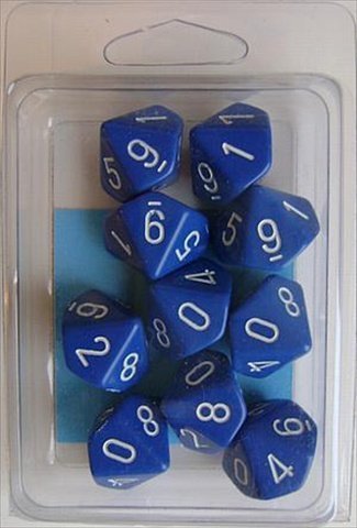 Features. Chessex Dice Sets Opaque Blue with White - Ten Sided Die d10. All dice read from the top for easy comprehension - Uses underscoring to differentiate 6 and 9. Sharp edges for easy shape recognition - Numbers are as large as possible on each face. This set contains ten d10 dice. Set of 10. Item Weight - 0.12 lbs.
