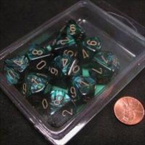 Features. Chessex 10 - die set. Ten sided dice. All dice read from the top for easy comprehension Sharp edges for easy shape recognition. Recommended age group - 12. Color - Scarab Jade with gold numbering. Material - Plastic. Shape - Polyhedral. Item weight - 0.1 lbs.