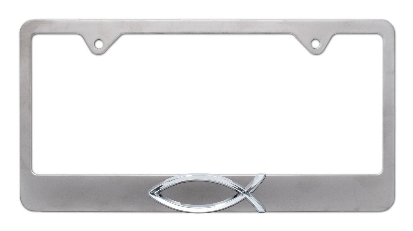 Christian Fish License Plate Frame By Elektroplate. All-Metal (Not Plastic) Frame With A Heavy-Duty Matte Finish With A Shiny 3D Chrome Emblem Adhered. All Elektroplate License Plate Frames Are Comprised Of An All-Metal Frame With A Powder Coated Finish Made To Withstand Harsh Outdoor Conditions. This Christian Fish Chrome Frame Will Look Brand New For Years To Come (As Opposed To Cheap Imitations That Will Fade Or Chip Within Months Of Being On Your Vehicle). Our High-End License Plate Frames Are The Perfect Way To Showcase Your Religious Pride Everywhere You Drive. In Addition, All Elektroplate Products Are Packaged In Elegant Retail Packaging To Make A Great Gift!