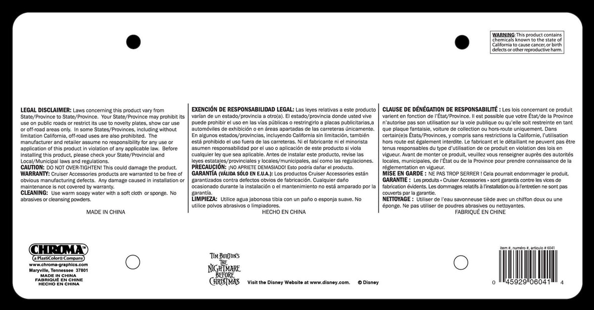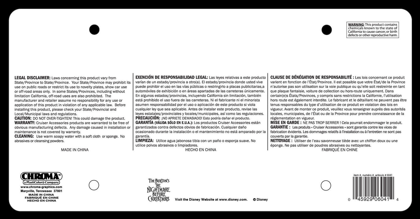 Q: What is the Chroma 6041 Nightmare Before Christmas Jack Plastic Frame made of?A: The Chroma 6041 Nightmare Before Christmas Jack Plastic Frame is made of durable polystyrene plastic, ensuring a lightweight yet sturdy design for your vehicle.