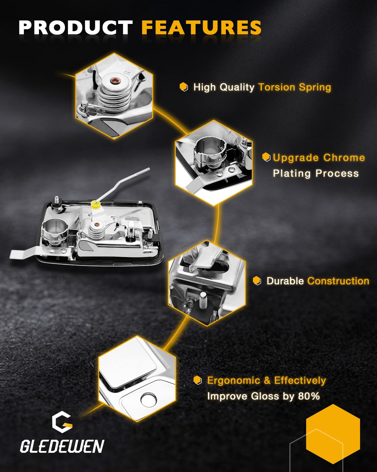 Packing List: 1x Chrome Exterior Front Left Driver Side Door Handle with Keyhole 1x Chrome Exterior Front Right Passenger Side Door Handle with Keyhole 1x Chrome Exterior Rear Left Driver Side Door Handle 1x Chrome Exterior Rear Right Passenger Side Door Handle Condition: New Compatible with: 2000-2005 Ford Excursion 1999-2016 Ford F-250 Super Duty 1999-2016 Ford F-350 Super Duty 1999-2016 Ford F-450 1999-2016 Ford F-550 2000-2015 Ford F-650 2000-2013 Ford F-750 Precise Fit Part Numbers: Front Driver Side: 79306, FO1310123, 4C3Z2522405AAA, 7C3Z2522405CA, 7C3Z2522405AA, 7C3Z2522405-AA-MTL, 7C3Z2522405AAMTL, F81Z2522405BAC, F81Z2522405BAB Front Passenger Side: 79307, FO1311123, 4C3Z2522404AAA, 7C3Z2552404CA, 7C3Z2522404AA, 7C3Z2522404-AA-MTL, 7C3Z2522404AAMTL, F81Z2522404BAB, F81Z2522404BAC, FO-3523A-FR Rear Driver Side: 7C3Z2626601AA, FO1520104, 5C3Z2626601AAA Rear Passenger Side: 7C3Z2626600AA, FO1521104, F81Z2626601AAB Broken door handle? Can 't get in your car? Are you searching for the highest quality, best replacement value door handle? We deserve it. Our Door Handle kit, to replace your old or broken part, will meet or exceed OEM standards.