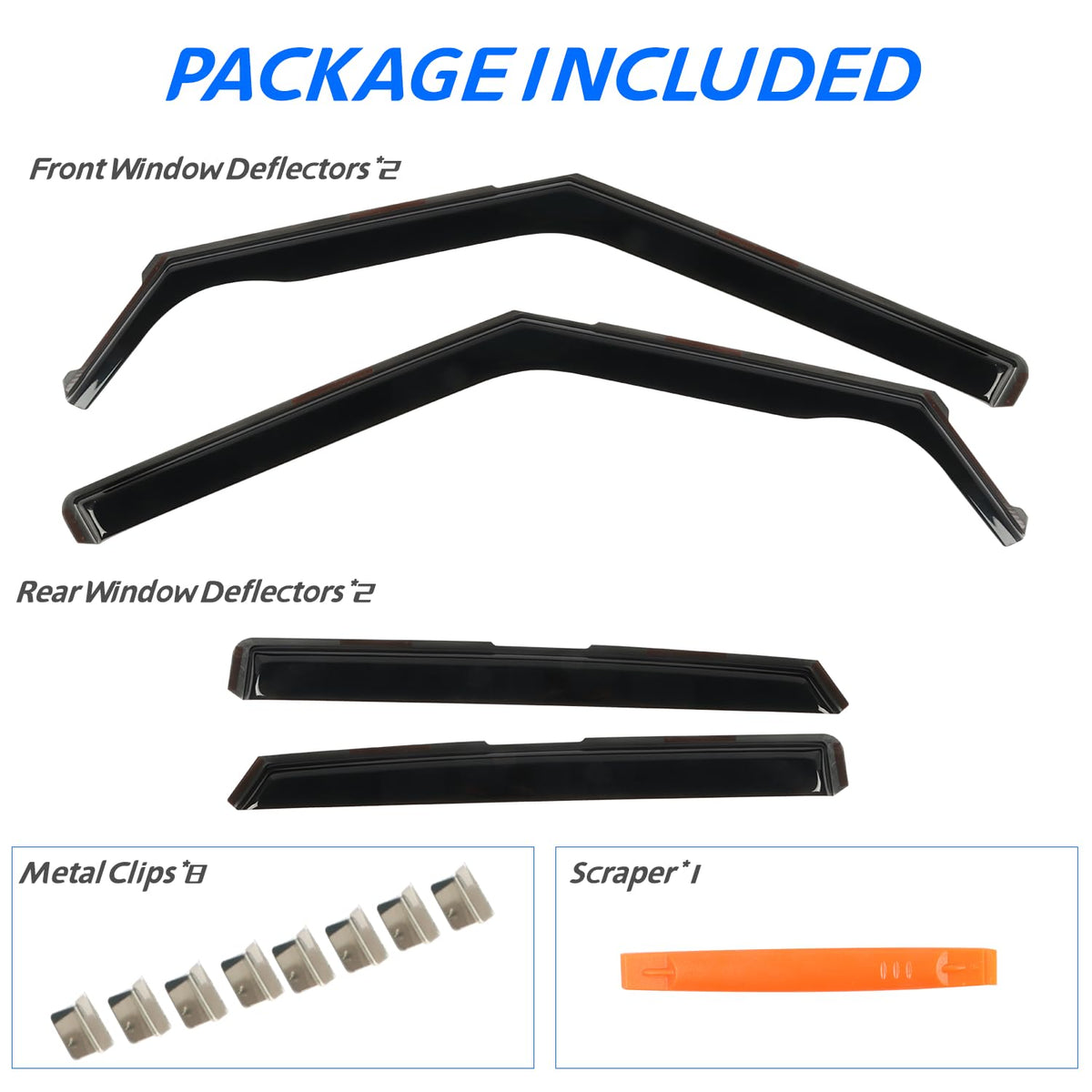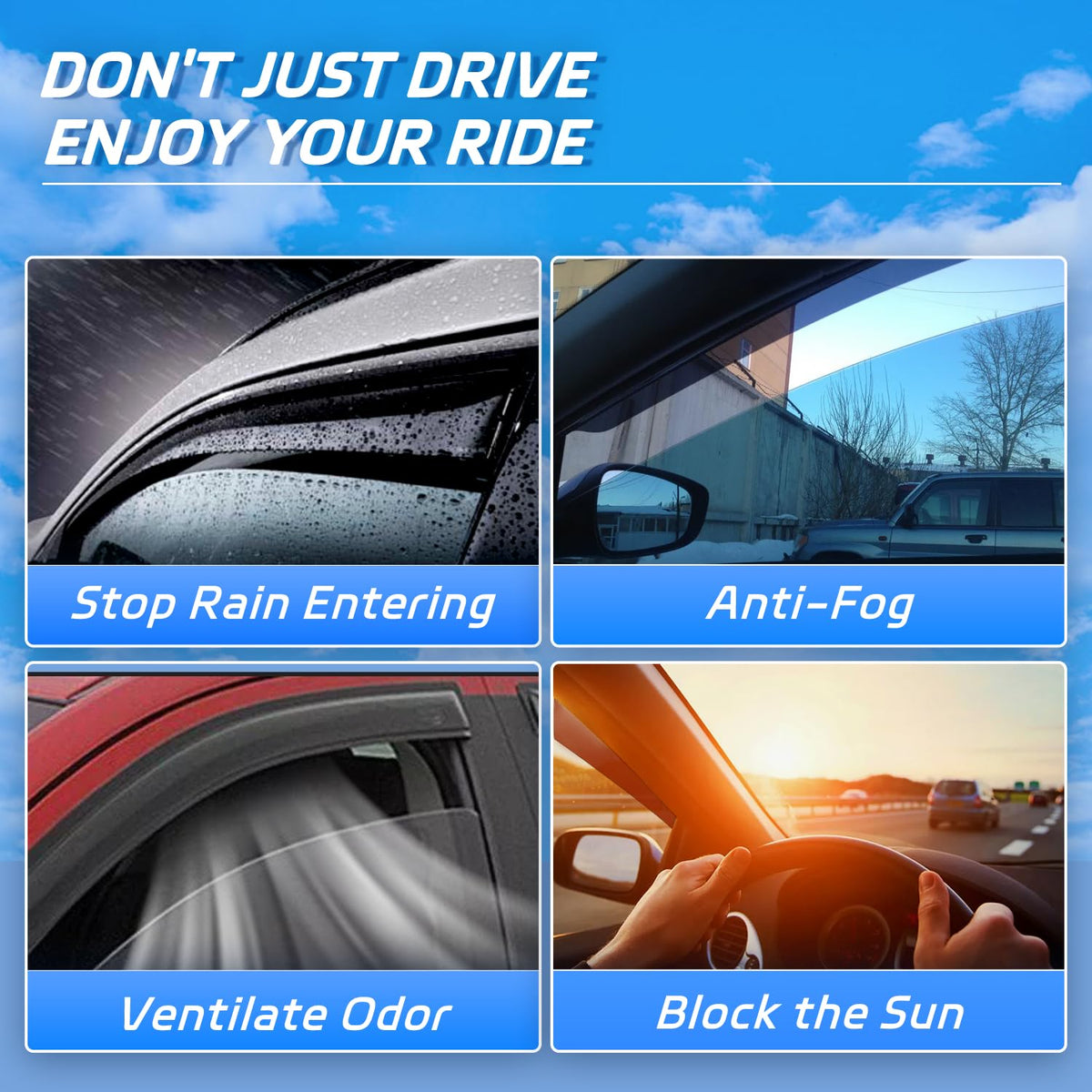The rain guards fit for car window construct with high-grade impact-resistant acrylic thats scratch resistant, car wash safe, and will never fade or discolor from exposure to the sun. You could enjoy the fresh air and keep the rain drops out after installing the vent visors window shade and keeping the window cracked open, no foggy worries.