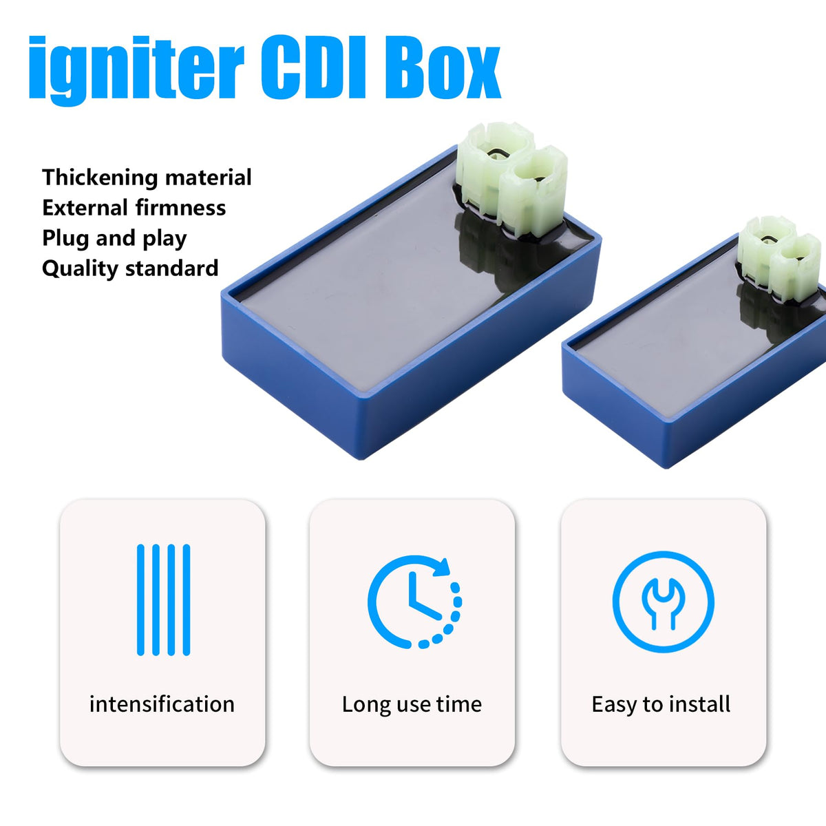 Q: What are the key features of this ignition coil and CDI box?A: This ignition coil and CDI box set features high-quality materials for durability, easy installation, and includes essential components such as an ignition coil, spark plug, CDI, blue air nozzle caps, and ties.