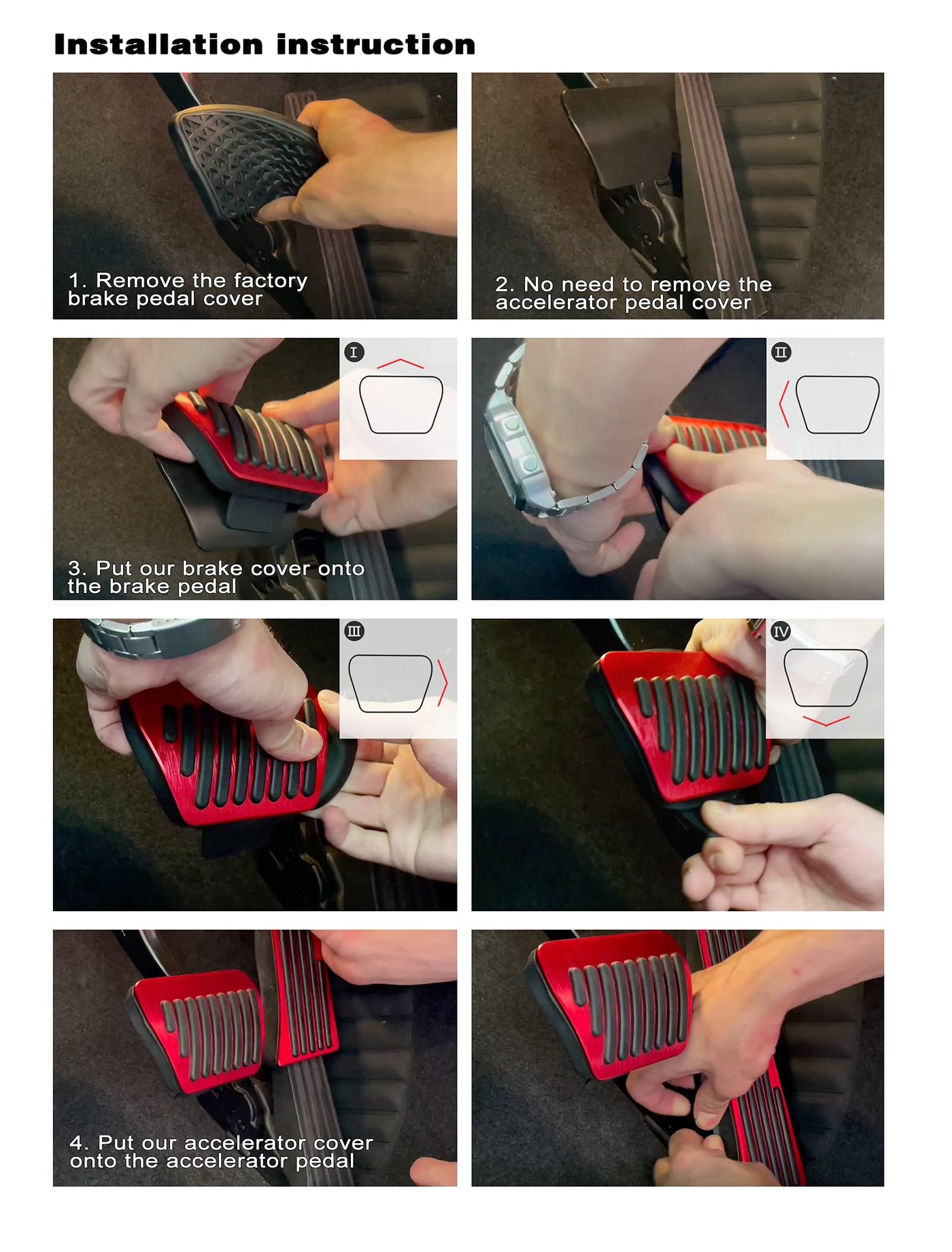Q: How do I install the brake and gas pedal covers?A: Installation is easy; simply remove the factory brake pedal cover and place the new one on. The gas pedal cover can be installed directly on top of the existing pedal without removal.