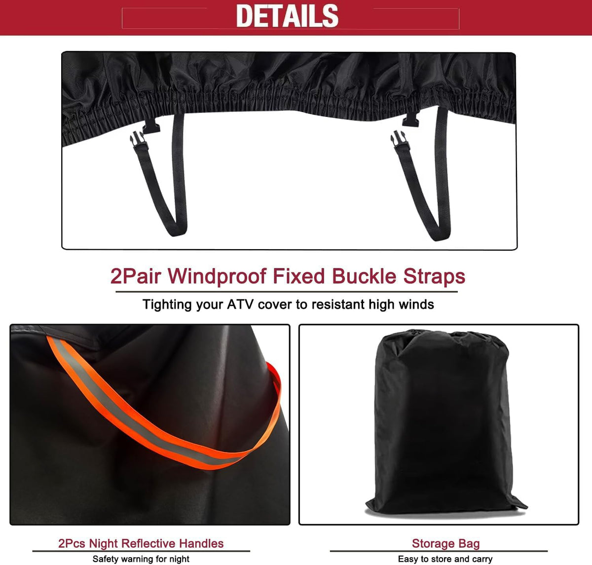 *****About Size***** The size of your utv is less than 2-4 inch than the cover, it is most suitable,so measures size before you pruchase please,Thank You! ClawsCover founder Evan is a motorcycle rider,we have focus on produce outdoor covers,we have motorcycle cover/ATV cover /UTV cover /bike cover /mobility scooter cover/PingPong table cover/outdoor sofa cover, the brand name(ClawsCover) means to can not broken by the wolf's claws,the cover should be durable & waterproof & windproof & sun protection & dust protection and more,we hope all of the covers can solve your needs,save your money and being happy own it. if have any quality defects and wrong size,24 hours contact us for free,we'll give a satisfy answer for you! Specifications:Brand:ClawsCover Size:L x H x W -115x59x74.8 inches Material: 420D oxford cloth ,Reflective strap :2 straps ,windproof strap:2 adjustable windproof straps, Vents quantity:2 vents, Elastic band:all elastic band at the bottom of cover,other cover just have a part elastic band, Washing:hand wash or washing machine, Package size:13.7x11.8 inches,Features:Heavy duty,Waterproof, Windproof ,Snowproof, Dustproof,Tearproof,UV Protection, Fadeless,Package Inclued: 1 * ClawsCover UTV Cover 1 * Easy To Carry Storage Bag*****Very Important*****1.When use the bike cover please tight the windproof straps avoild to being blown into the water.2.When you storage the cover, keep it dry for longer life. 3.Any cover with vents maybe enter a little water when it is blowing strong winds, please paying particular attention to this situation.4.If the size don't fit your car,you can return it,but don't damage the cover and storage bag,thank you.