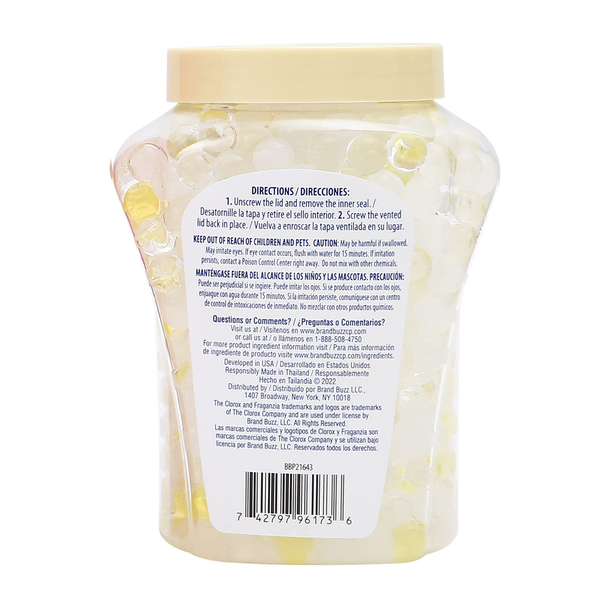 The unique and inviting scents of Clorox Fraganzia enhance your home, car, or office in a quick and convenient way. The nature-inspired scents such as Coconut Colada, Island Orchid, Lavender, Sweet Rosewater, and Fresh Ocean Breeze exude lasting freshness wherever you choose to use them. It isn't unusual for recurring, unwanted smells to make their way into your living room, bedroom, bathroom, car, or kitchen. Clorox Fraganzia Air Freshener Crystal Beads can give these areas an instant scent makeover when it needs it most. These gel beads are convenient to use and don't require any maintenance. Simply open the jar, remove the protective seal, replace the vented lid, and place the jar anywhere you need a quick boost of fresh scent. You can also pour the beads into your favorite jar, vase, or potpourri dish to incorporate into your d cor - just be sure to keep out of reach of children and pets for safety. The light and airy Coconut Colada scent is light and pleasant and not overpowering, leaving a lovely tropical coconut aroma in any room. Browse our whole collection of Coconut Colada products from Clorox Fraganzia or try a new aroma from our wide range of nature-inspired scents. It will be hard to pick which room to leave your container of Clorox Fraganzia Air Freshener Beads in. Directions: 1. Unscrew the lid and remove the seal from lid. 2. Peel off the top label from the lid. 3. Screw vented lid back in place. Enjoy! Caution: May be harmful if swallowed, May irritate eyes. Do not mix with other chemicals. Do not get in eyes. Keep out of reach of children and pets.