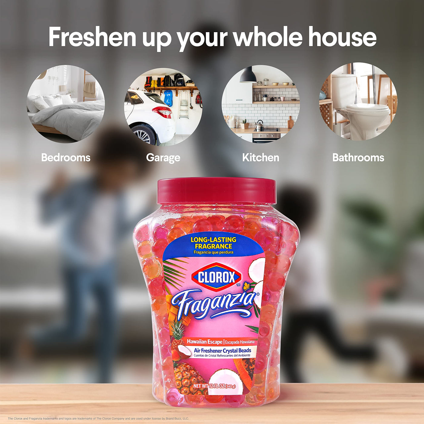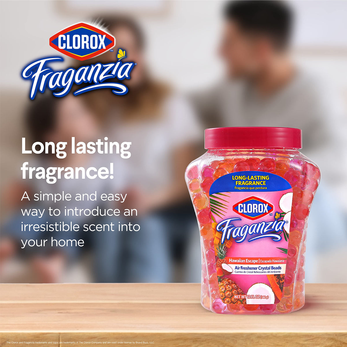 The unique and inviting Clorox Fraganzia scents are here to enhance your home, car, or office. The nature-inspired scents are incredibly long-lasting and exude freshness, wherever you choose to use them.Clorox Fraganzia Air Freshener Crystal Beads are here to give your home an instant scent makeover when it needs it most. It isn't unusual for recurring, unwanted smells to make their way into your living room, bathroom, car, or kitchen. These gel beads can sit anywhere in your home and don't require any maintenance. The inviting Hawaiian Escape scent is noticeable, but not overpowering.These air refresher beads are ideal for homes with pets, but are a wonderful addition to any home demanding a new signature scent. It will be hard to pick which room to leave your container of Clorox Fraganzia Air Freshener Beads in. Directions: 1. Unscrew the lid and remove the seal from lid. 2. Peel off the top label from the lid. 3. Screw vented lid back in place. Enjoy!Caution: May be harmful if swallowed, May irritate eyes. Do not mix with other chemicals. Do not get in eyes. Keep out of reach of children and pets.In addition to this light and refreshing scent from Clorox Fraganzia, also be sure to check out our other scents including Frosted Cranberry, Morning Sky, Lavender Fields, Apple Cinnamon, Wild Berries, Fresh Winter Pine, Lavender, and Spring. Air fresheners from Clorox Fraganzia are just what you need to keep your home, car, or any room smelling fresh and clean.YOUR SATISFACTION IS OUR PRIORITY. For any questions or feedback, please reach out to us directly at Brand Buzz CP.