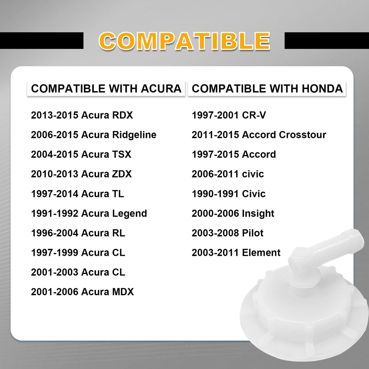 ---Suitable For---Our coolant caps Compatible with 2013-2015 Acura RDX,Compatible with 2006-2015 Acura Ridgeline,Compatible with 2004-2015 Acura TSX,Compatible with 2010-2013 Acura ZDX,Compatible with 1997-2014 Acura TL,Compatible with 1991-1992 Acura Legend,Compatible with 1996-2004 Acura RL,Compatible with 1997-1999 Acura CL,Compatible with 2001-2003 Acura CL,Compatible with 2001-2006 Acura MDX,Compatible with 1997-2001 CR-V,Compatible with 2011-2015 Accord Crosstour,Compatible with 1997-2015 Accord,Compatible with 2006-2011 Civic,Compatible with 1990-1991 Civic,Compatible with 2000-2006 Insight,Compatible with 2003-2008 Pilot,Compatible with 2003-2011 Element---Product Information---OEM: 19106-RNA-A48