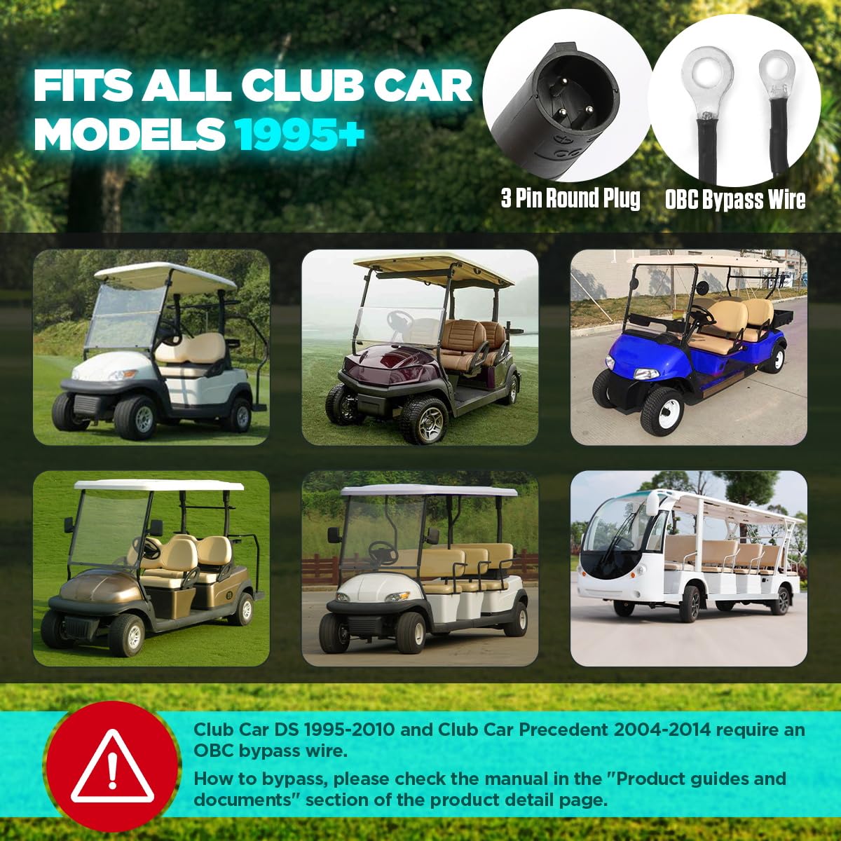 Q: What types of golf carts is the CMTOOL 48V charger compatible with?A: The CMTOOL 48V charger is widely compatible with all Club Car golf carts manufactured from 1995 to the present, including models such as DS, Precedent, Tempo, and Villager. It comes with an OBC bypass cable for specific compatibility with Club Car DS models from 1995-2010 and Precedent models from 2004-2014.
