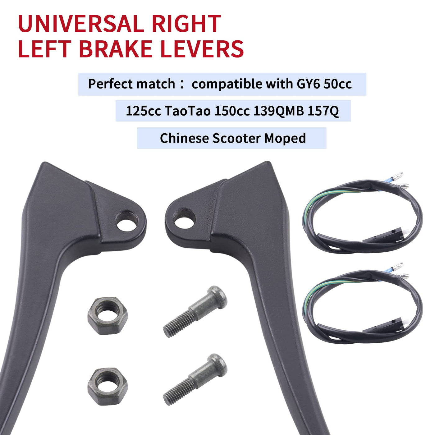 CNCMOTOK Universal Right Left Brake Lever fit for GY6 50cc 125cc 150cc 139QMB 157Q Roketa Jonway Taotao Chinese Scooter Moped Parts Perfect match :compatible with GY6 50cc 125cc TaoTao 150cc 139QMB 157Q Chinese Scooter Moped Size: Lever length :145mm,Mounting Inner Diameter: 6mm Package include:2 x brake lever,1 x Wires ,2 x Mounting Screws Professional after-sales:We sell professional auto parts ,and provide technical support. If you have any problems or dissatisfaction after receiving the products, We will solve the problem as soon as possible
