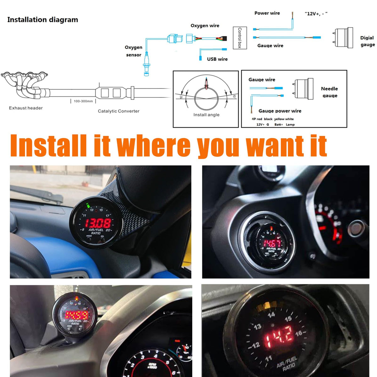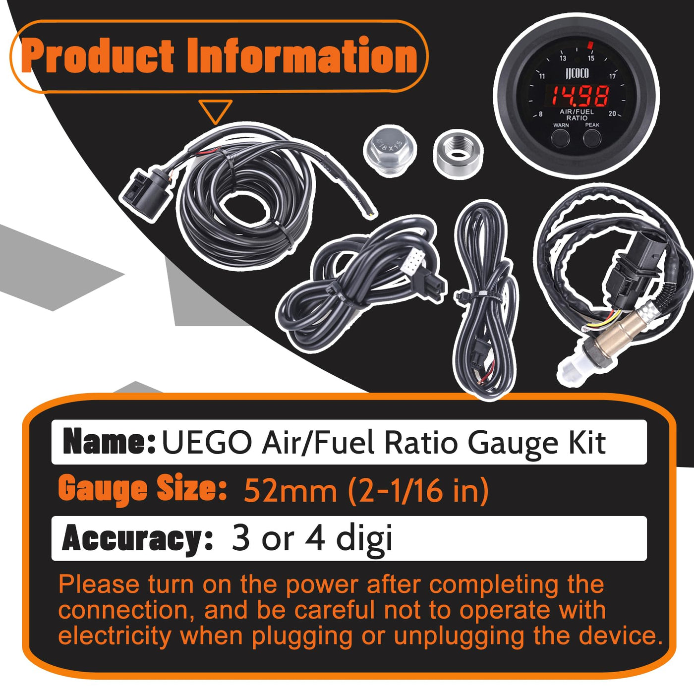 Easy Installation:Wideband AFR gauge is made of high quality materials and technology and is easy to install thanks to its standard 52mm housing. You can easily install it in almost any location. at the same time, it never requires free-air calibration when used with our wideband O2 UEGO AFR gauge | Flexibility and Expandability: The controller box in the kit is highly flexible and expandable. Users can adjust and expand the controller box configuration to meet the requirements of different vehicles and applications. The ability to customize the controller box's connections and parameters according to the engine management system's specifications and personal preferences to achieve the best fit and performance optimization | Wide Compatibility:Our air fuel ratio gauge comes in a standard 52mm (2-1/16 inch) housing that fits in a variety of instrument pods, providing flexible mounting options. Compatible with vehicle/system voltages up to 16V | Accurate and Fast Feedback:The UGEO Air Fuel Ratio Gauge is equipped with a 4.9 LSU sensor that provides real-time feedback with high accuracy and fast response time. It responds instantly to every 0.1 change in air/fuel ratio, giving you more time and accurate information when making adjustments | Versatile design: In addition to measuring and displaying the air/fuel ratio, the Air/Fuel Ratio Gauge also features a broadband measurement and digital display. This means you have access to more comprehensive data and insight into your engine's combustion state for precise tuning and optimization