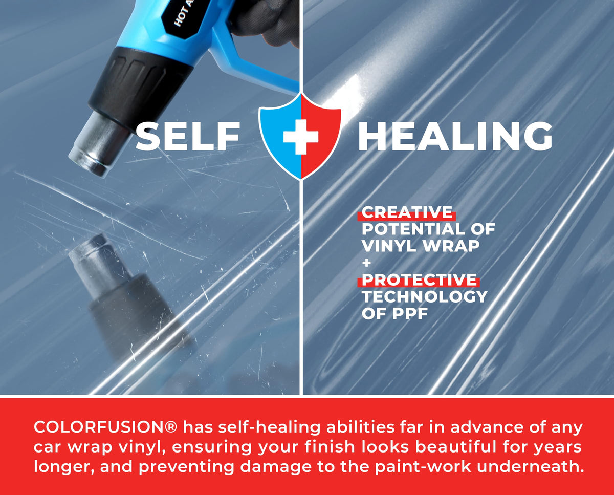 ColorFusion PPF by VViViD combines the durability of Paint Protection Film (PPF) with the beauty of VViViDs industry-leading wraps, ensuring your vehicles finish remains pristine twice as long as other films. The adhesive backing has a micro air-release pattern that expels air bubbles without needing wet application. Gentle heat from a heat gun can heal scratches on the wrap, a feature not found in other films. ColorFusion uses a surface-safe, heat-activated, removable adhesive that wont damage your cars top-coats. The patented ULTRA-FINISH formula magnifies every imperfection, making prep and installation more challenging. Tips for the best finish include using a clay bar for added surface clarity and applying the film while holding excess material off the surface to avoid trapped air and distortions. If bubbles occur, press them softly or puncture to release air. Specifications: thickness of 7.5 mils, dry application, Nano Air-release, Ultra-Finish UV topcoat, and enhanced self-healing finish. The adhesive is acrylic-based, repositionable, and pressure-sensitive, with a durability that is twice the lifespan of other automotive vinyl wraps. For wet application, lightly mist the surface and dry off 1-2'' from the edges for better adhesion. Areas needing stretch can be left dry for better tack. Trim the film to shape once installed and press wet areas with a towel, allowing time to dry before sealing. These steps ensure a professional and flawless finish with ColorFusion film.