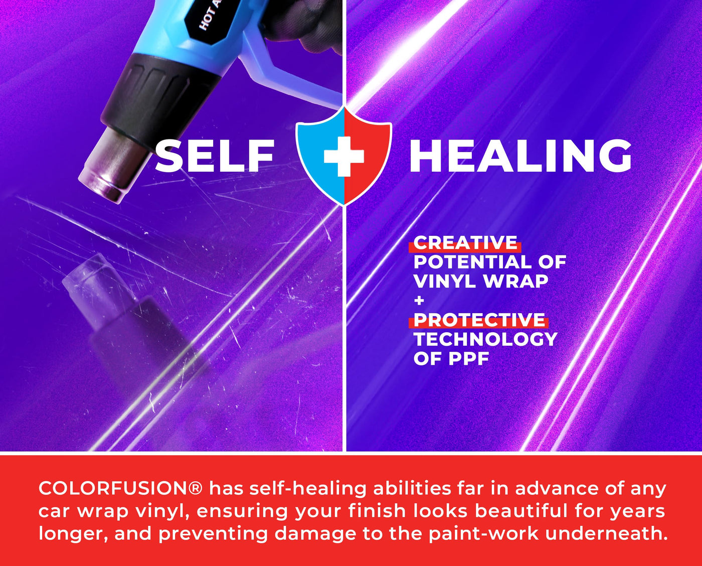 ColorFusion PPF by VViViD combines the durability of Paint Protection Film (PPF) with the beauty of VViViDs industry-leading wraps, ensuring your vehicles finish remains pristine twice as long as other films. The adhesive backing has a micro air-release pattern that expels air bubbles without needing wet application. Gentle heat from a heat gun can heal scratches on the wrap, a feature not found in other films. ColorFusion uses a surface-safe, heat-activated, removable adhesive that wont damage your cars top-coats. The patented ULTRA-FINISH formula magnifies every imperfection, making prep and installation more challenging. Tips for the best finish include using a clay bar for added surface clarity and applying the film while holding excess material off the surface to avoid trapped air and distortions. If bubbles occur, press them softly or puncture to release air. Specifications: thickness of 7.5 mils, dry application, Nano Air-release, Ultra-Finish UV topcoat, and enhanced self-healing finish. The adhesive is acrylic-based, repositionable, and pressure-sensitive, with a durability that is twice the lifespan of other automotive vinyl wraps. For wet application, lightly mist the surface and dry off 1-2'' from the edges for better adhesion. Areas needing stretch can be left dry for better tack. Trim the film to shape once installed and press wet areas with a towel, allowing time to dry before sealing. These steps ensure a professional and flawless finish with ColorFusion film.