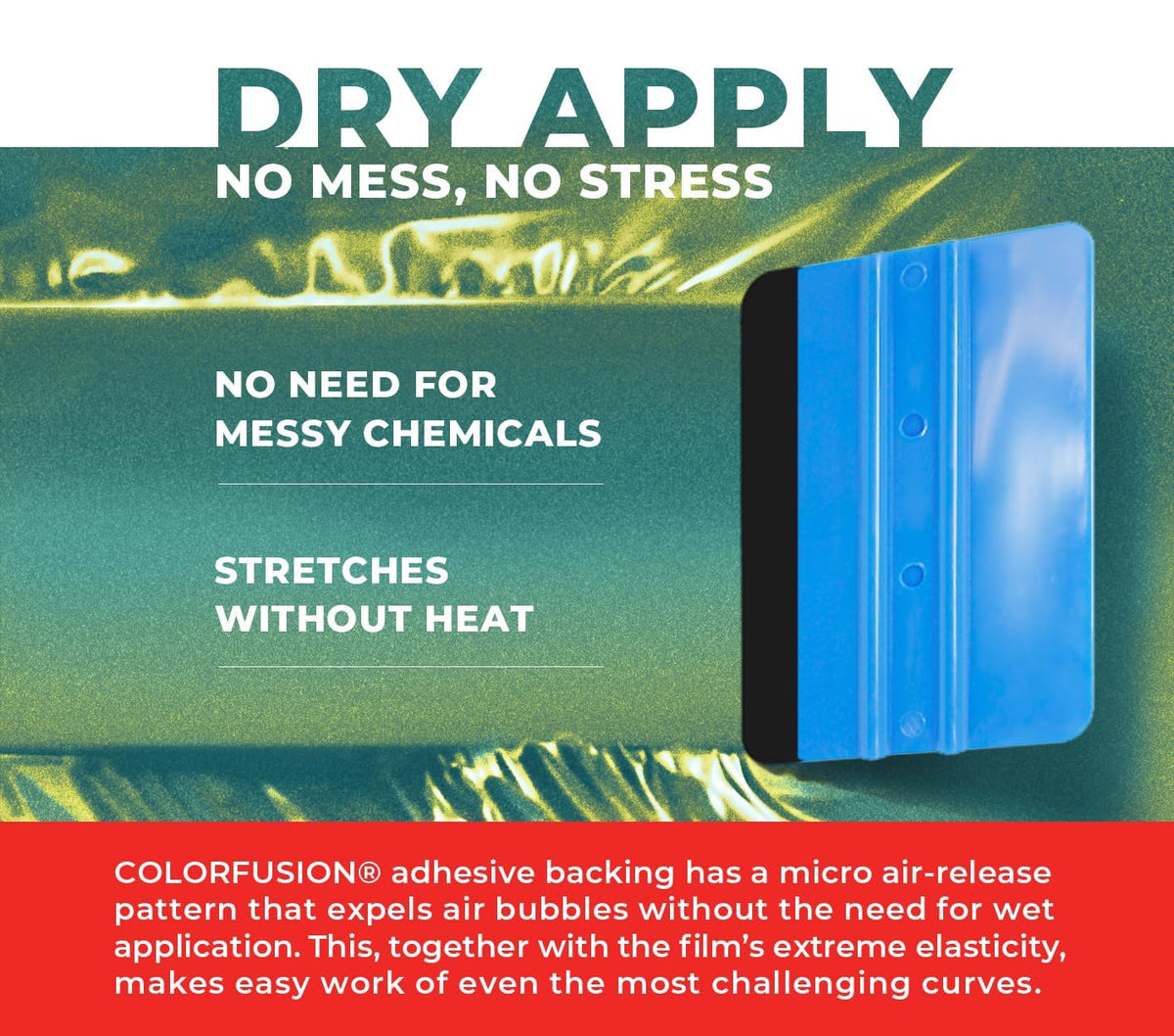 ColorFusion PPF by VViViD combines the durability of Paint Protection Film (PPF) with the beauty of VViViDs industry-leading wraps, ensuring your vehicles finish remains pristine twice as long as other films. The adhesive backing has a micro air-release pattern that expels air bubbles without needing wet application. Gentle heat from a heat gun can heal scratches on the wrap, a feature not found in other films. ColorFusion uses a surface-safe, heat-activated, removable adhesive that wont damage your cars top-coats. The patented ULTRA-FINISH formula magnifies every imperfection, making prep and installation more challenging. Tips for the best finish include using a clay bar for added surface clarity and applying the film while holding excess material off the surface to avoid trapped air and distortions. If bubbles occur, press them softly or puncture to release air. Specifications: thickness of 7.5 mils, dry application, Nano Air-release, Ultra-Finish UV topcoat, and enhanced self-healing finish. The adhesive is acrylic-based, repositionable, and pressure-sensitive, with a durability that is twice the lifespan of other automotive vinyl wraps. For wet application, lightly mist the surface and dry off 1-2'' from the edges for better adhesion. Areas needing stretch can be left dry for better tack. Trim the film to shape once installed and press wet areas with a towel, allowing time to dry before sealing. These steps ensure a professional and flawless finish with ColorFusion film.