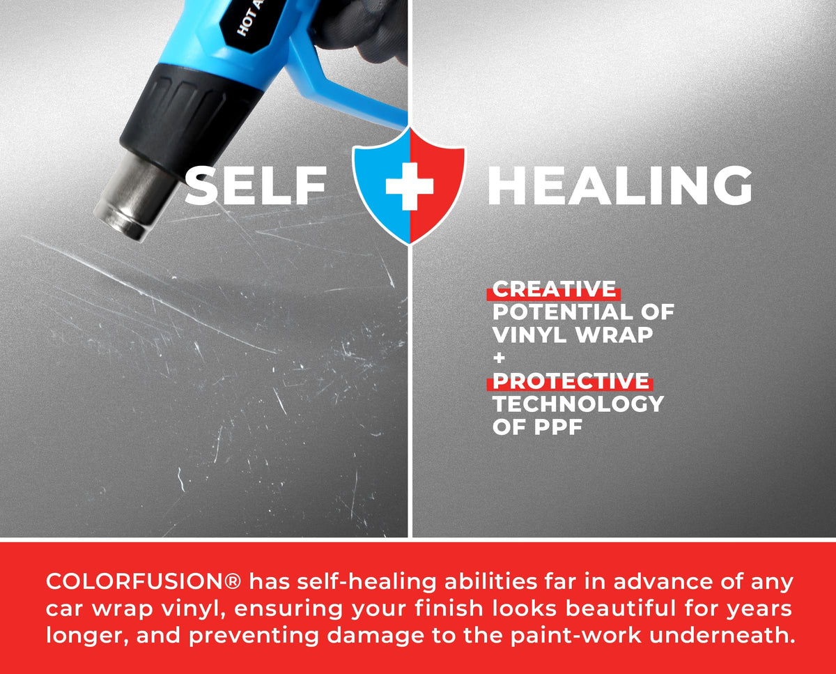 ColorFusion PPF by VViViD combines the durability of Paint Protection Film (PPF) with the beauty of VViViDs industry-leading wraps, ensuring your vehicles finish remains pristine twice as long as other films. The adhesive backing has a micro air-release pattern that expels air bubbles without needing wet application. Gentle heat from a heat gun can heal scratches on the wrap, a feature not found in other films. ColorFusion uses a surface-safe, heat-activated, removable adhesive that wont damage your cars top-coats. The patented ULTRA-FINISH formula magnifies every imperfection, making prep and installation more challenging. Tips for the best finish include using a clay bar for added surface clarity and applying the film while holding excess material off the surface to avoid trapped air and distortions. If bubbles occur, press them softly or puncture to release air. Specifications: thickness of 7.5 mils, dry application, Nano Air-release, Ultra-Finish UV topcoat, and enhanced self-healing finish. The adhesive is acrylic-based, repositionable, and pressure-sensitive, with a durability that is twice the lifespan of other automotive vinyl wraps. For wet application, lightly mist the surface and dry off 1-2'' from the edges for better adhesion. Areas needing stretch can be left dry for better tack. Trim the film to shape once installed and press wet areas with a towel, allowing time to dry before sealing. These steps ensure a professional and flawless finish with ColorFusion film.