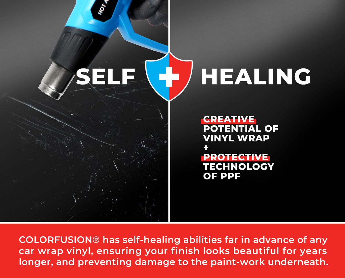 ColorFusion PPF by VViViD combines the durability of Paint Protection Film (PPF) with the beauty of VViViDs industry-leading wraps, ensuring your vehicles finish remains pristine twice as long as other films. The adhesive backing has a micro air-release pattern that expels air bubbles without needing wet application. Gentle heat from a heat gun can heal scratches on the wrap, a feature not found in other films. ColorFusion uses a surface-safe, heat-activated, removable adhesive that wont damage your cars top-coats. The patented ULTRA-FINISH formula magnifies every imperfection, making prep and installation more challenging. Tips for the best finish include using a clay bar for added surface clarity and applying the film while holding excess material off the surface to avoid trapped air and distortions. If bubbles occur, press them softly or puncture to release air. Specifications: thickness of 7.5 mils, dry application, Nano Air-release, Ultra-Finish UV topcoat, and enhanced self-healing finish. The adhesive is acrylic-based, repositionable, and pressure-sensitive, with a durability that is twice the lifespan of other automotive vinyl wraps. For wet application, lightly mist the surface and dry off 1-2'' from the edges for better adhesion. Areas needing stretch can be left dry for better tack. Trim the film to shape once installed and press wet areas with a towel, allowing time to dry before sealing. These steps ensure a professional and flawless finish with ColorFusion film.