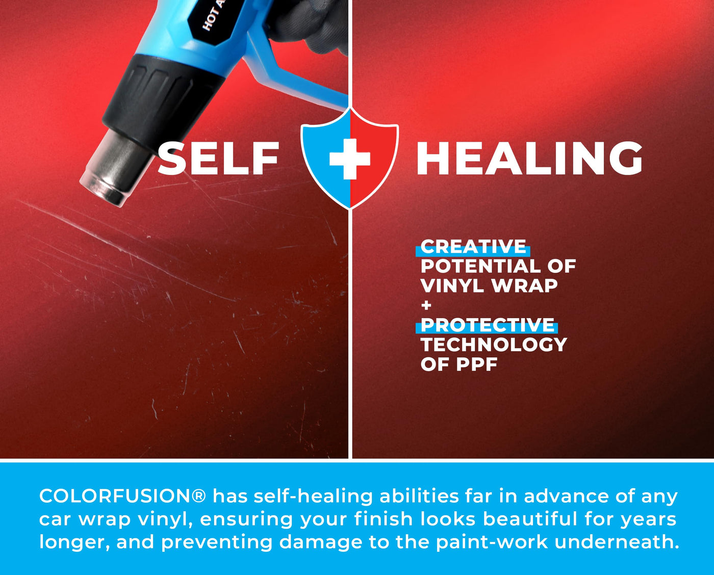 ColorFusion PPF by VViViD combines the durability of Paint Protection Film (PPF) with the beauty of VViViDs industry-leading wraps, ensuring your vehicles finish remains pristine twice as long as other films. The adhesive backing has a micro air-release pattern that expels air bubbles without needing wet application. Gentle heat from a heat gun can heal scratches on the wrap, a feature not found in other films. ColorFusion uses a surface-safe, heat-activated, removable adhesive that wont damage your cars top-coats. The patented ULTRA-FINISH formula magnifies every imperfection, making prep and installation more challenging. Tips for the best finish include using a clay bar for added surface clarity and applying the film while holding excess material off the surface to avoid trapped air and distortions. If bubbles occur, press them softly or puncture to release air. Specifications: thickness of 7.5 mils, dry application, Nano Air-release, Ultra-Finish UV topcoat, and enhanced self-healing finish. The adhesive is acrylic-based, repositionable, and pressure-sensitive, with a durability that is twice the lifespan of other automotive vinyl wraps. For wet application, lightly mist the surface and dry off 1-2'' from the edges for better adhesion. Areas needing stretch can be left dry for better tack. Trim the film to shape once installed and press wet areas with a towel, allowing time to dry before sealing. These steps ensure a professional and flawless finish with ColorFusion film.