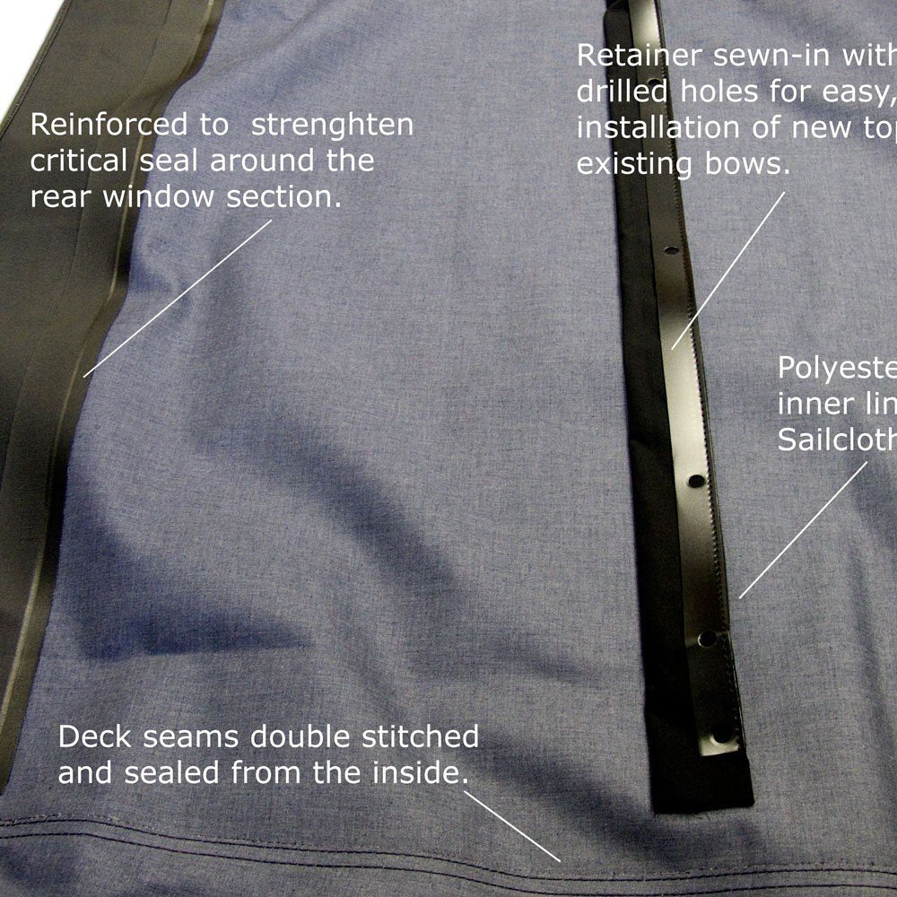 Q: What materials are used in the construction of this soft top?A: The soft top is made from high-quality sailcloth vinyl, which is durable and available in factory original colors for an authentic look.