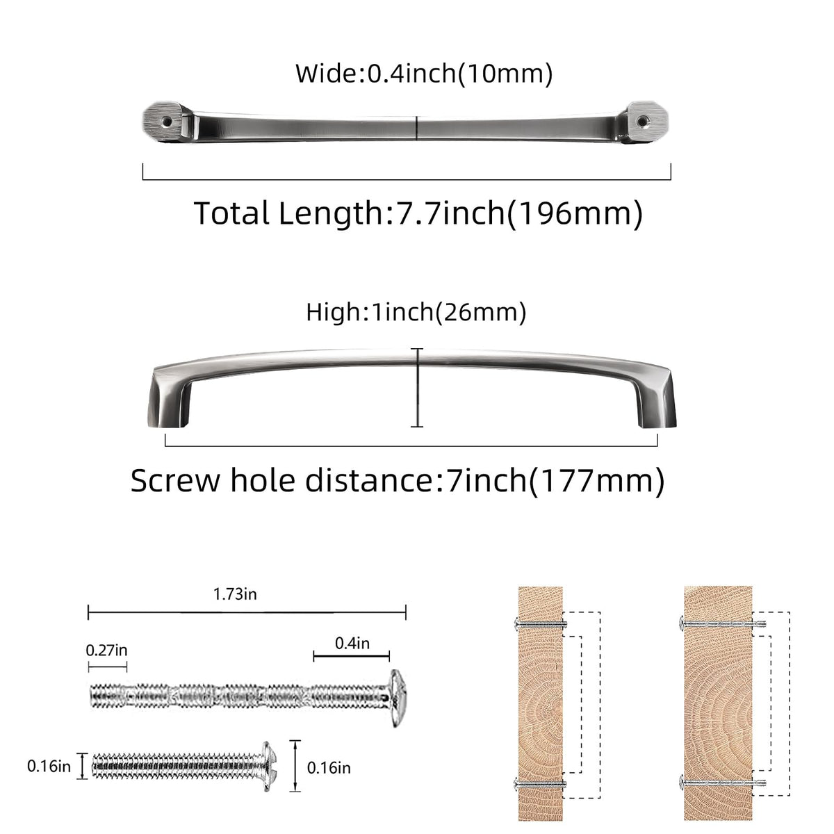 Q: What are the dimensions of the COTYKILEY cabinet handles?A: The COTYKILEY cabinet handles feature a 7-inch (177mm) hole center, an overall length of 7.7 inches (196mm), a width of 0.4 inches (10mm), and a projection of 1 inch (26mm).