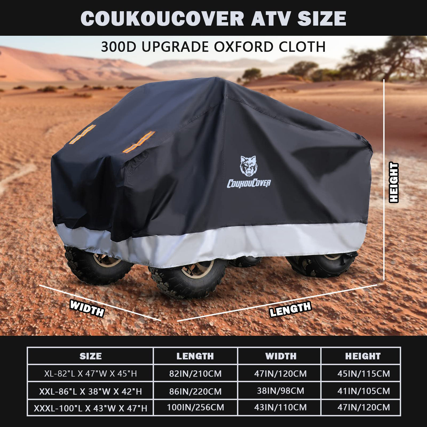 Q: What size ATV does the CoukouCover ATV Cover fit?A: The CoukouCover ATV Cover is designed to fit most 4-wheel ATVs up to 86 inches in length, making it suitable for models from brands like Honda, Kawasaki, Yamaha, Polaris, and Suzuki.