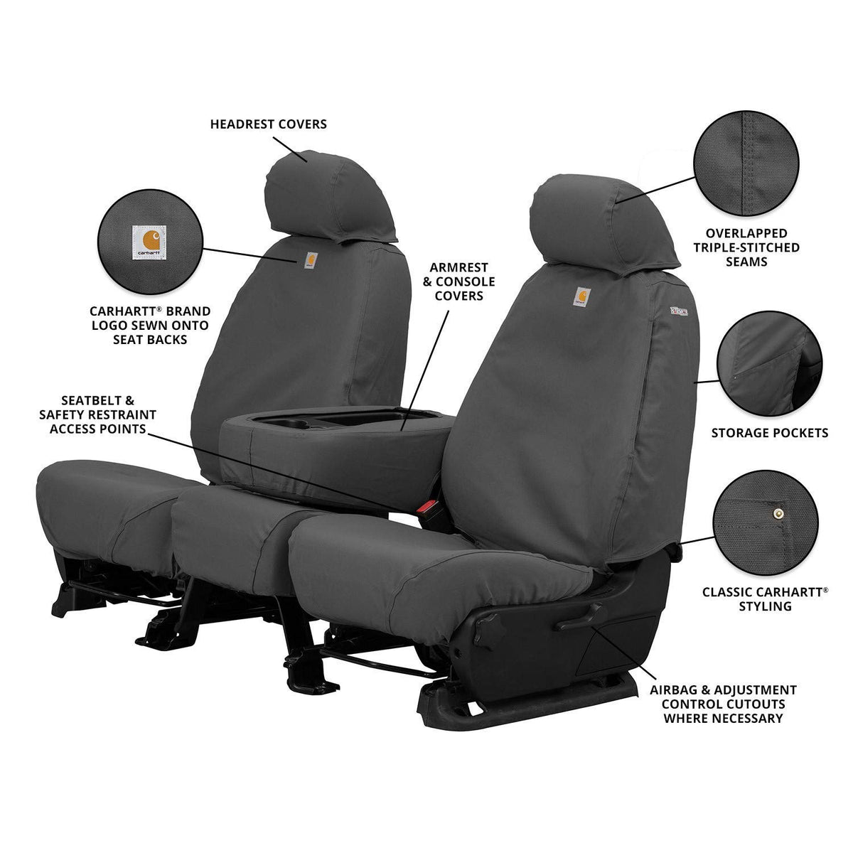 Carhartt SeatSaver Custom Seat Covers from Covercraft are the solution to the problem of keeping the seats in your truck or SUV clean and protected from daily use and weekend adventures. Made from durable, duck-weave fabric, these custom-fit seat covers protect your seats from dirt, mud, grime, spills and more. Featuring Rain Defender technology, a durable water repellency finish is added to the fabric to make it highly water resistant. Combine these features with the custom fitment and classic Carhartt styling, you get seat covers that look great and protect your seats from whatever you throw at them.