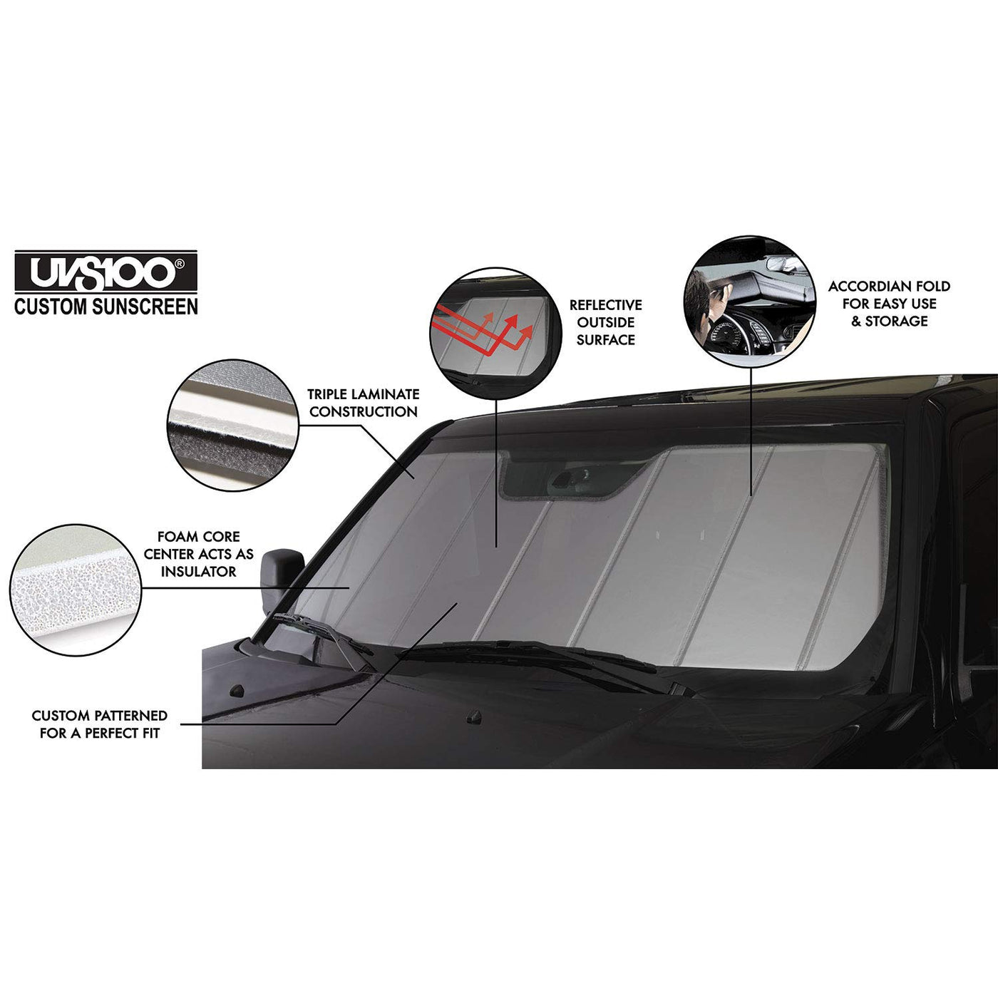 The UVS100 Custom Sunscreen is an affordable way to protect the interior of your vehicle from damaging UV rays as well as adding a level of comfort and protection by reducing the interior temperature of the vehicle on hot days. The sunscreen is made to fit your exact windshield, providing maximum coverage to keep your vehicle cooler.
