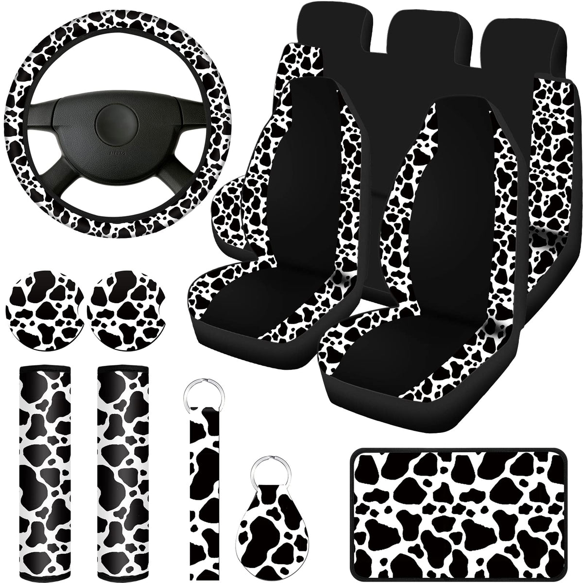 Cow Print Car Seat Covers Full Set For Women Men Cow Print Car Accessories Set Rubber Steering Wheel Cover Car Armrest Pad Cover