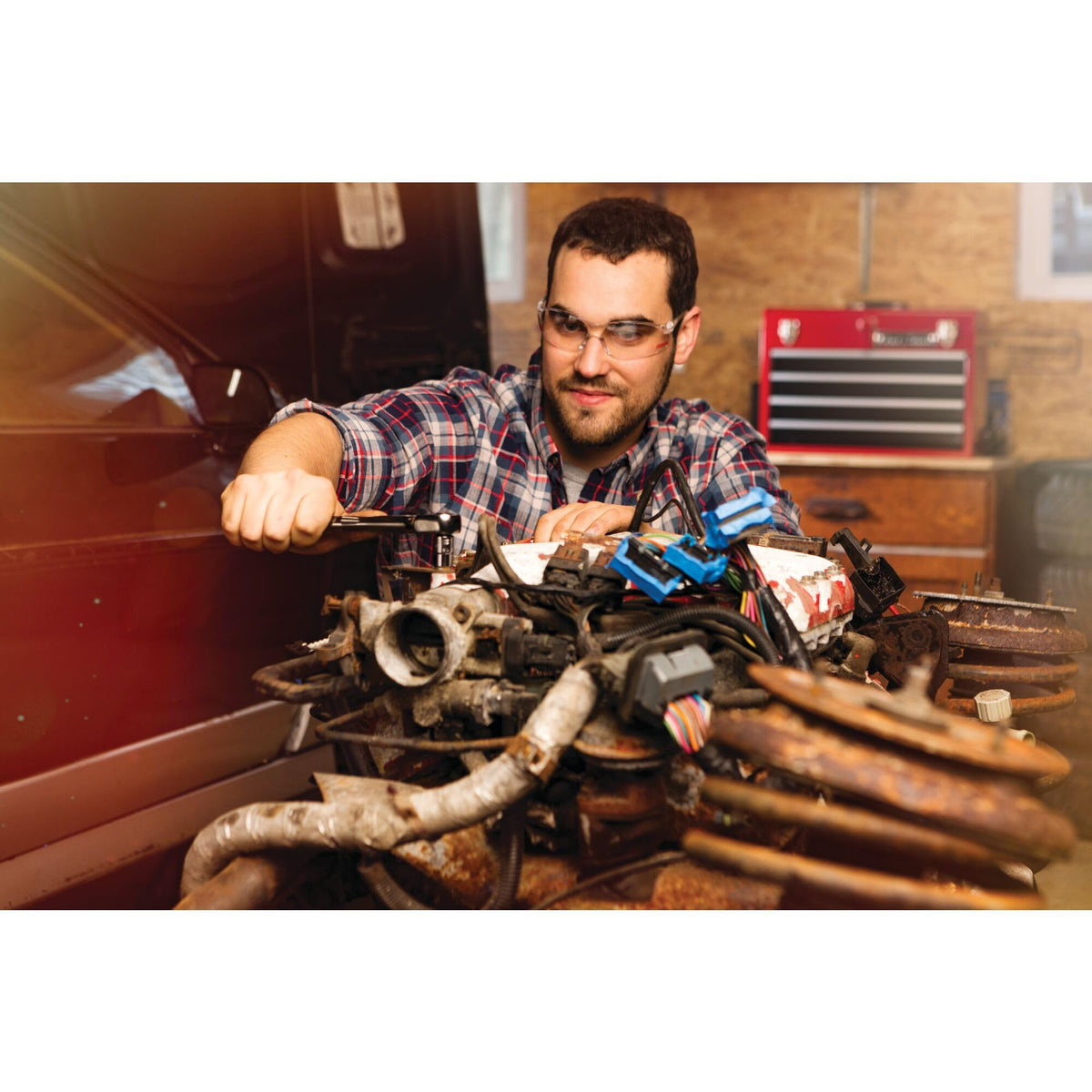 51 pc Gunmetal Chrome Mechanics Tool Set is perfect for the do-it-yourselfer or auto-enthusiast! This set comes with 120-Tooth ratchet for extreme accessibility. With its slim head and 3-degree arc swing, you can get into narrow spaces with ease and quickly tighten or loosen a fastener. This set also comes with a 6-in extension bar, universal joint, and bit adapter. A wide range of shallow and deep sockets provide added utility. The gunmetal chrome finish provides durable rust resistance, easy cleaning, and a professional look. All of these components are packed in a compact mobile case perfect for storage in a toolbox, garage, a vehicle or proudly displayed on your workbench. The case has durable metal clips and metal removable hinges for splitting the case into two for storage or ready availability. The case also has exterior grooves for stacking with same size cases. Take on your next project with our Gunmetal Chrome 51 pc tool set.