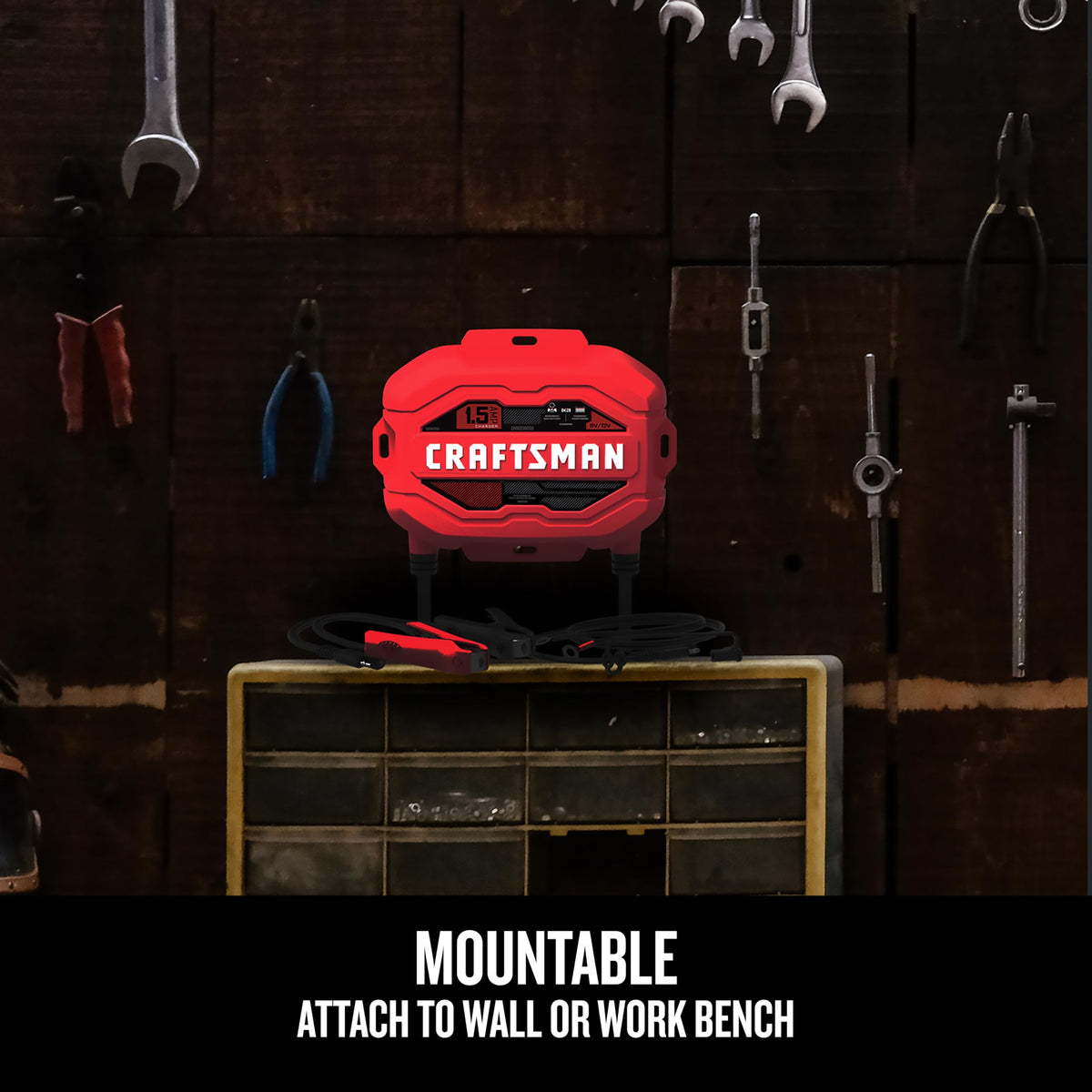 Keep your stored and infrequently used batteries in top condition by adding a battery maintainer to your home garage. Reflecting the quality CRAFTSMAN is known for, the CMXCESM259 1.5A 6V/12V Automotive Battery Charger and Maintainer will ensure battery health and longevity for all your 6V and 12V batteries. Fully automatic and microprocessor controlled, the CMXCESM259 features auto voltage detection, multi-stage charging, float mode monitoring, and reverse hook-up protection. The maintainer is also compatible with most battery types, including standard, AGM, gel, and deep-cycle batteries. For added safety and convenience, the CMXCESM259 feature integrated mounting slots that allow you to mount the unit to the wall outside of your work area. And with the included quick-connect clamps and quick-connect ring terminals you can attach the battery charger and maintainer to the battery in no time.