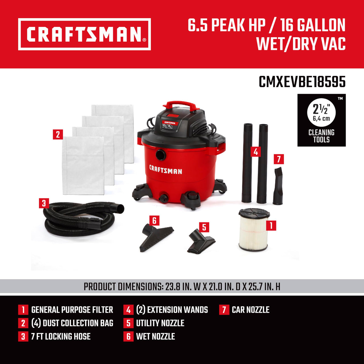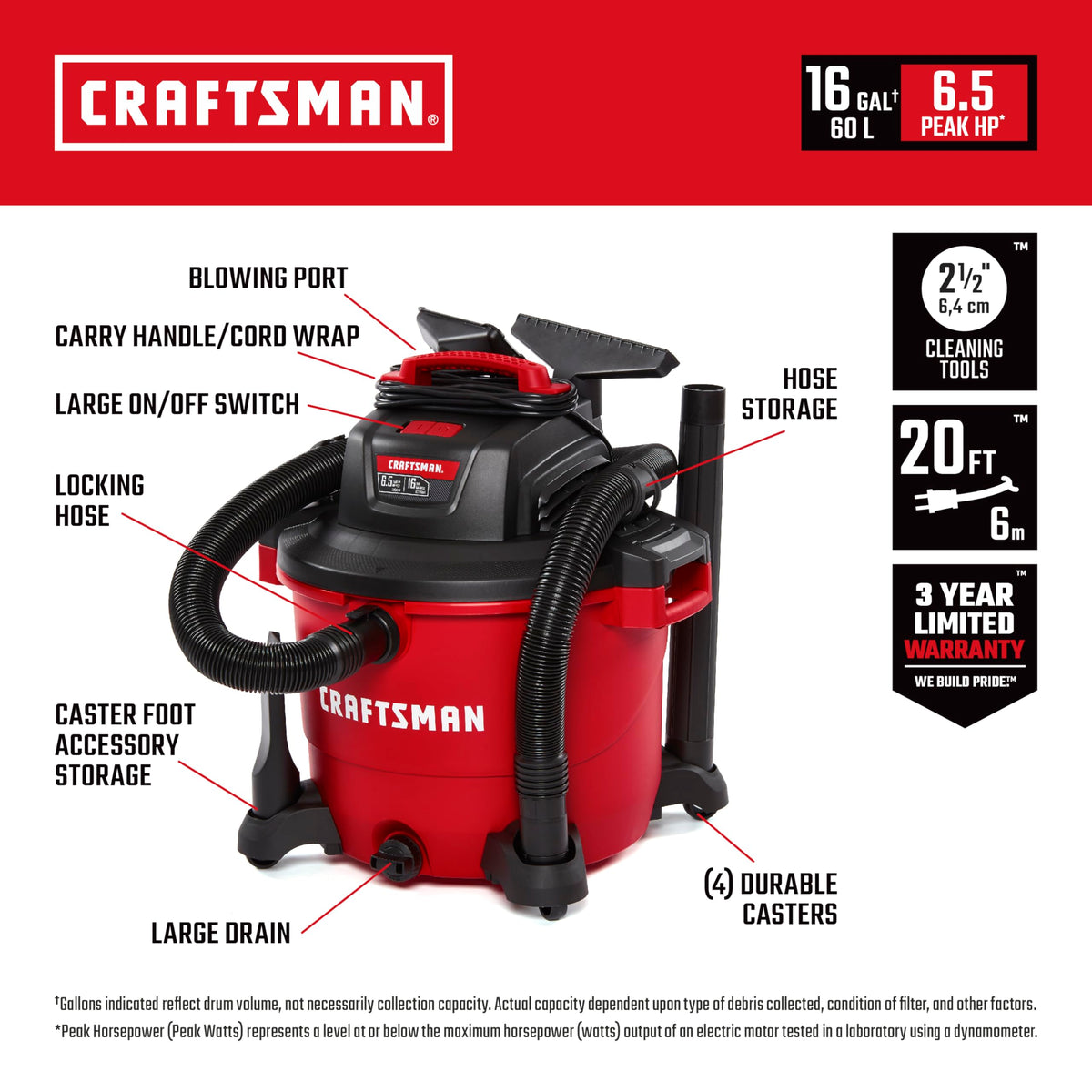The CRAFTSMAN 16 Gallon Wet/Dry Vac, featuring our most powerful 6.5 Peak HP motor, is the ideal solution for tackling large cleanup projects in the garage or on the jobsite that need the most power. Large scale renovations, builds, or floods are an easy task for this large shop vacuum. This wet dry vac includes a car nozzle, utility nozzle and wet nozzle. Also included is a large 2-1/2 in. diameter hose with added Dual-Flex that resists kinks and crushing. On-board hose storage plus accessory and power cord organizers help eliminate unneeded hassle and reduce overall storage space. The Qwik Lock Filter Fastening System allows for quick and easy wet dry vacuum filter changes. Equipped with an extra-large drain, the tank empties liquids quickly and easily. The blowing port directs high speed exhaust air through the hose giving you the ability to go from cleaning up from a renovation to blasting yard waste from the deck. The included dust collection bags are designed for pick-up of everyday dirt and other dry debris. They help contain all the debris from your home improvement projects, big or small and keep your vac from blowing the fine particles back into the air. Bags are easy to install by attaching to vacuum port inside tank without needing tools and are even easier to toss away. *Gallons indicated reflect drum volume, not necessarily collection capacity, actual capacity dependent upon type of debris collected, condition of filter and other factors. Peak horsepower represents a level at or below the maximum horsepower output of an electric motor tested in a laboratory using a dynamometer.