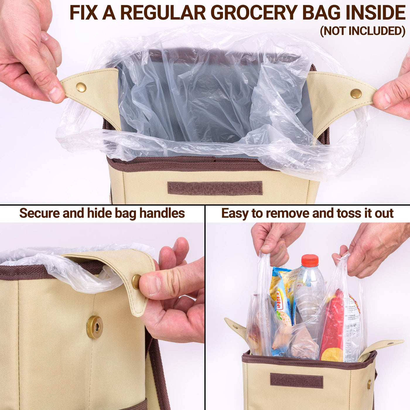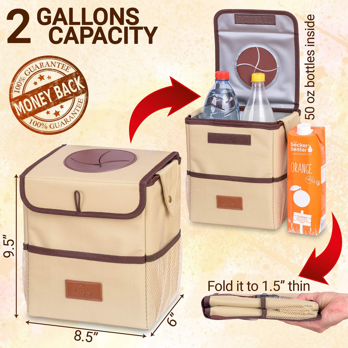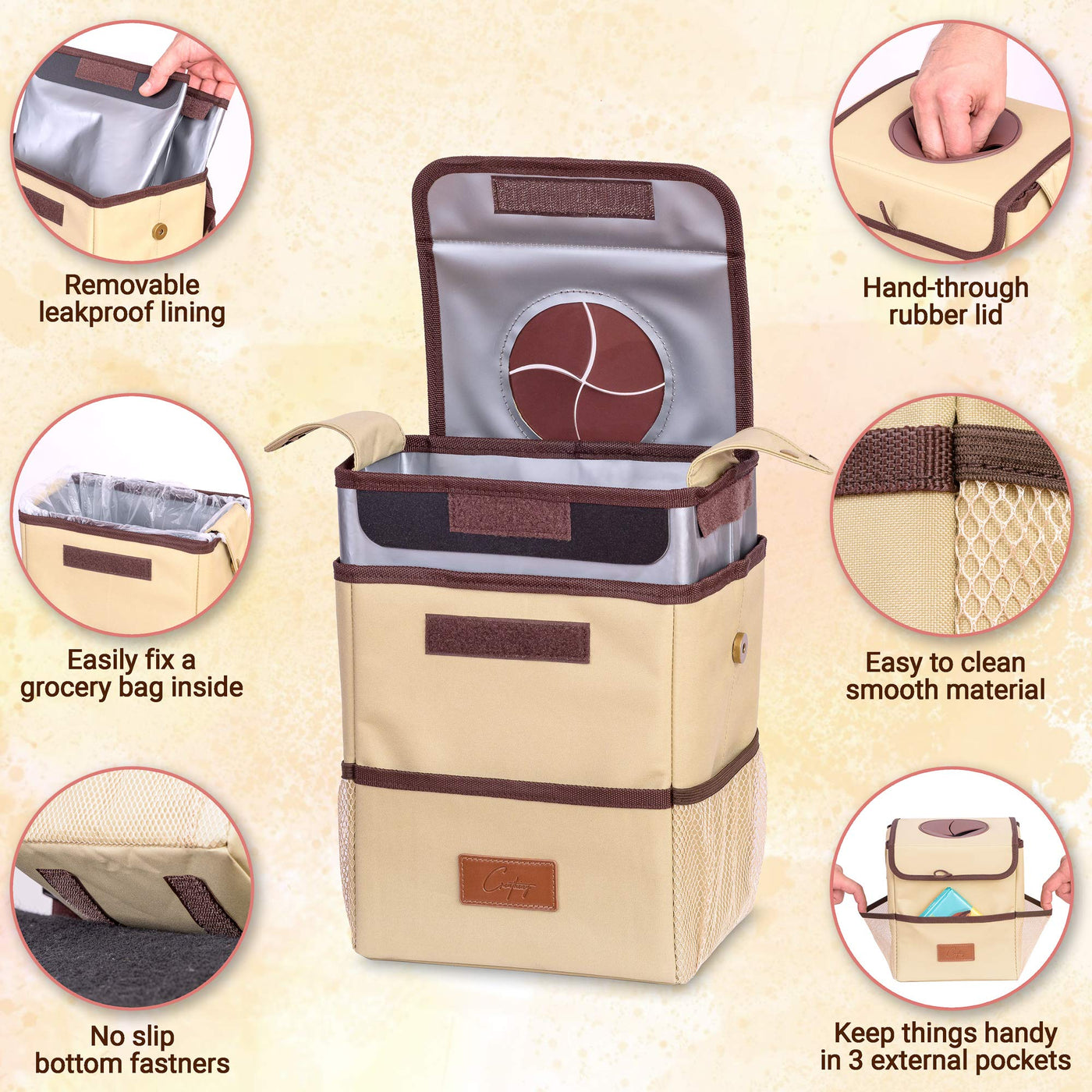 Creathing Car Trash Can With Lid And Detachable Lining | Waterproof, Foldable, Console Or Seat Hanging (2 Gal, Beige)