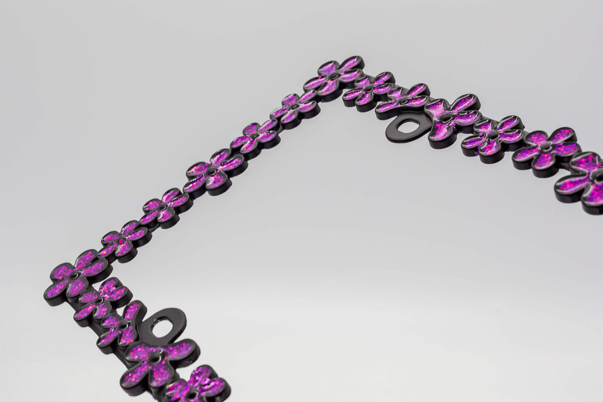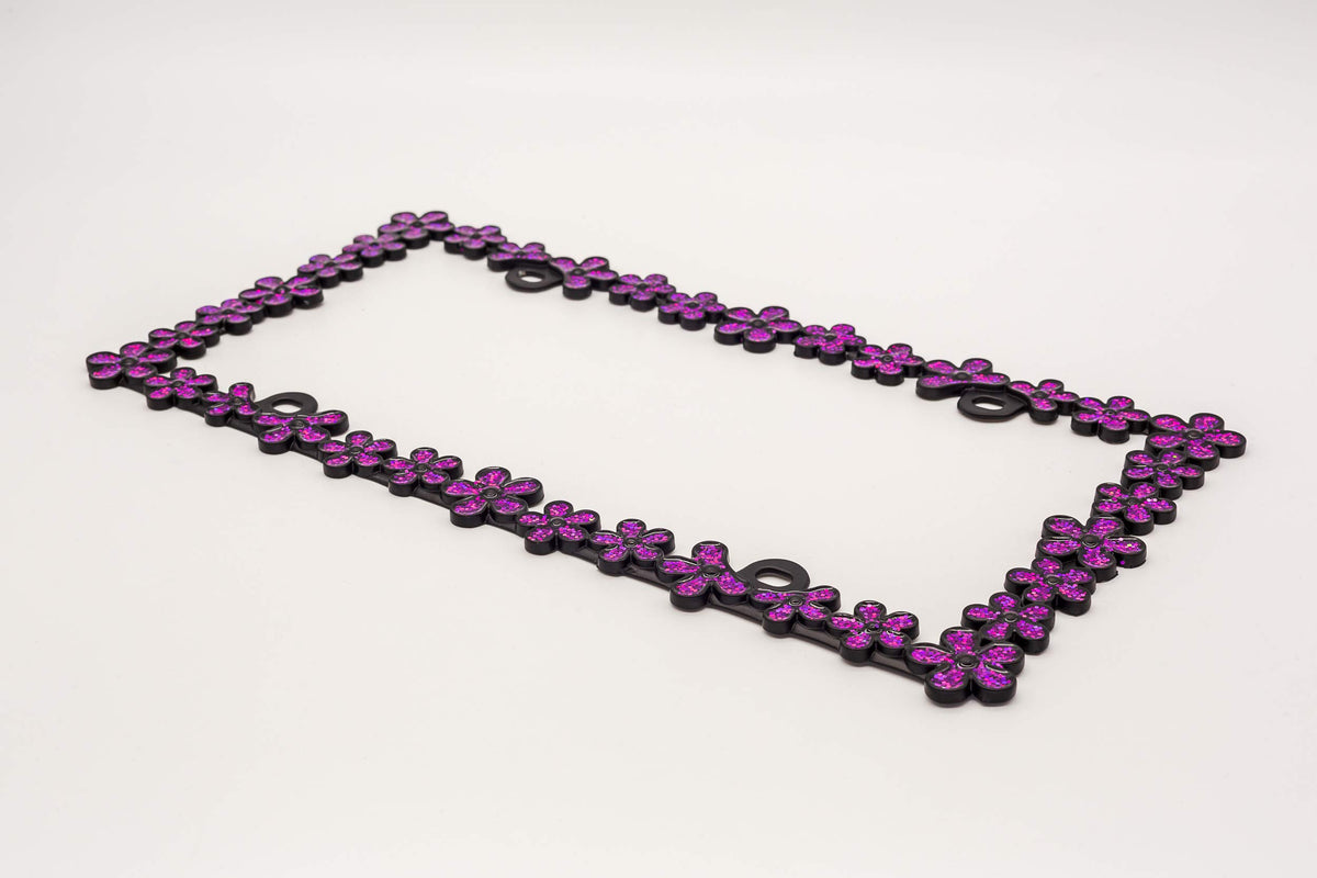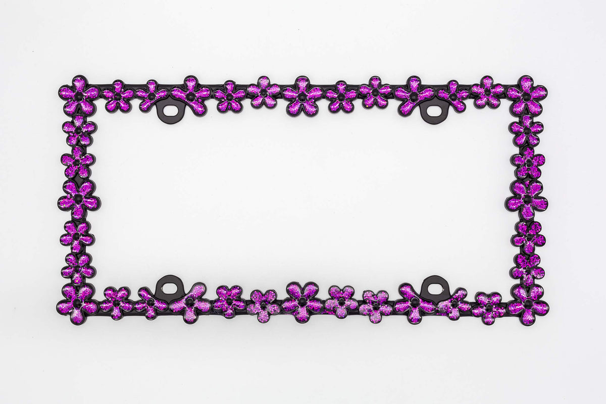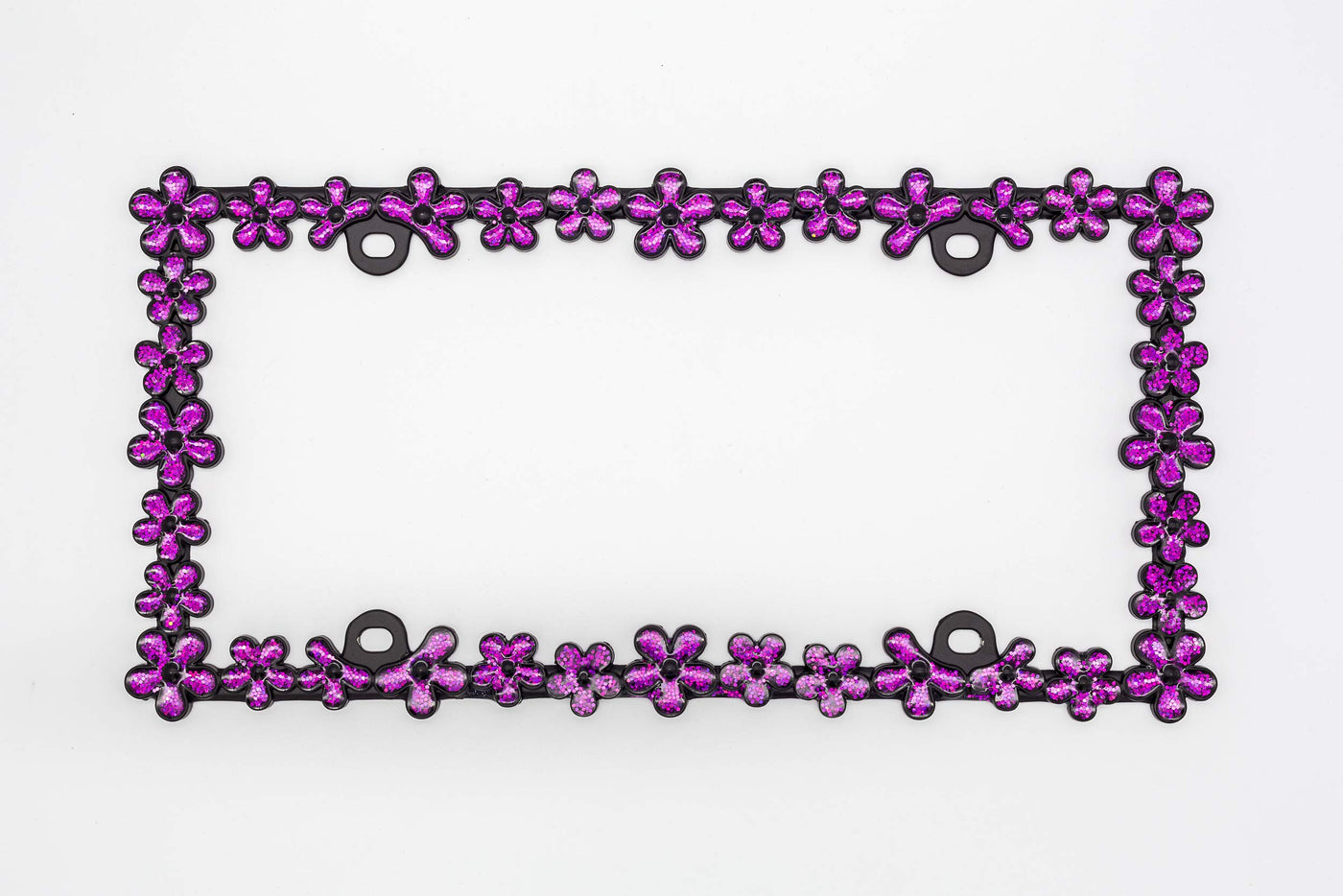 Creathome 3D Shining Daisy Wrenth License Plate Frame From Pure Zinc Alloy Metal Perfect Plate Holder,Matt Black With Purple Gli