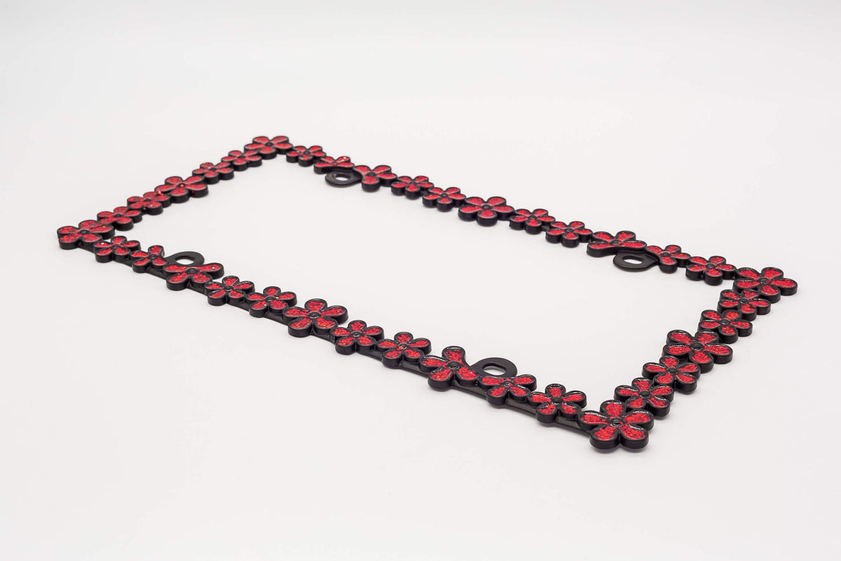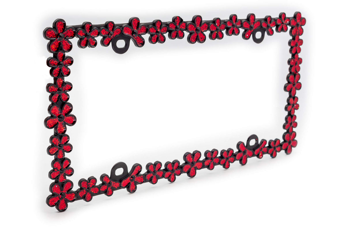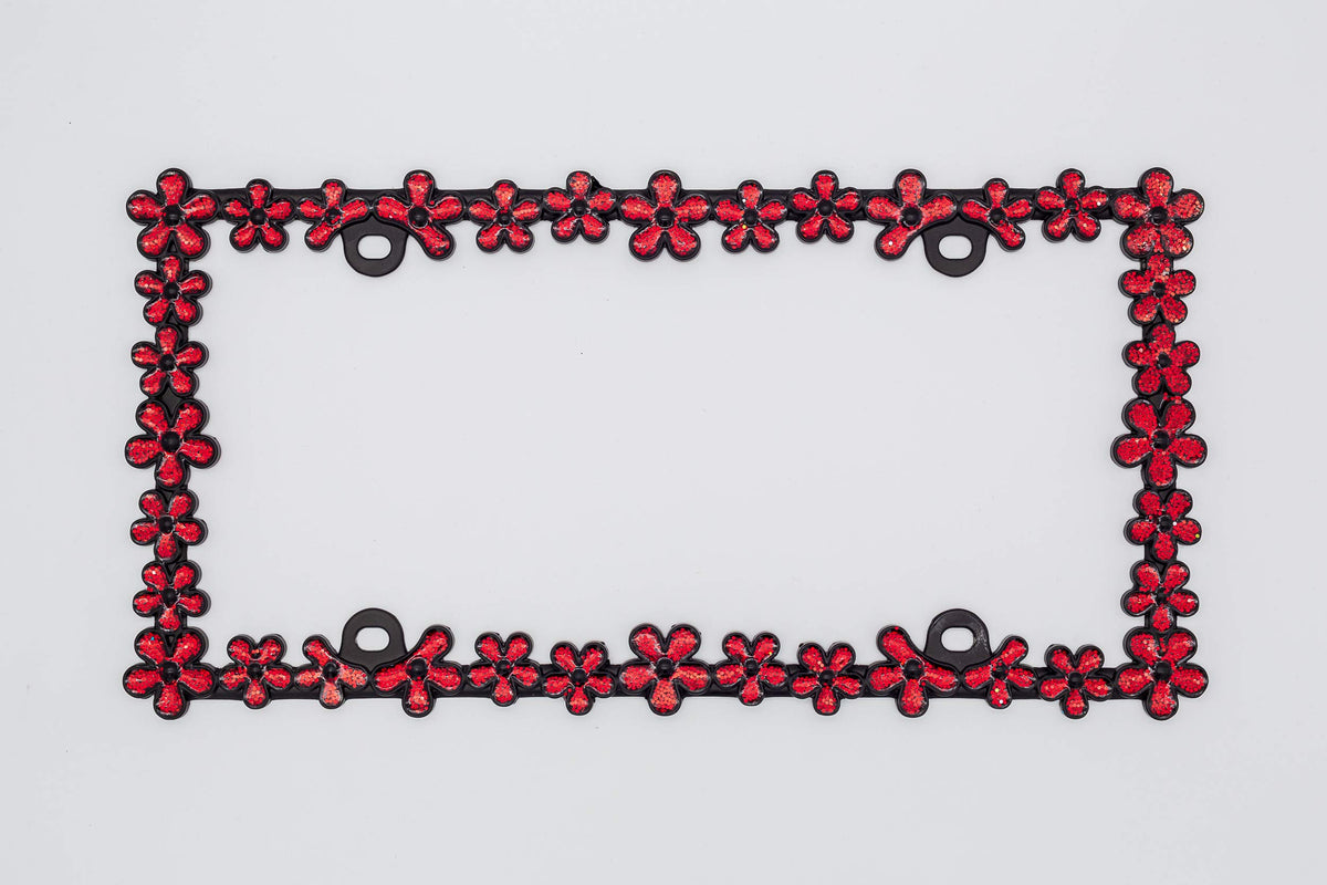 Creathome 3D Shining Daisy Wrenth License Plate Frame From Pure Zinc Alloy Metal Perfect Plate Holder,Matt Black With Red Glitte